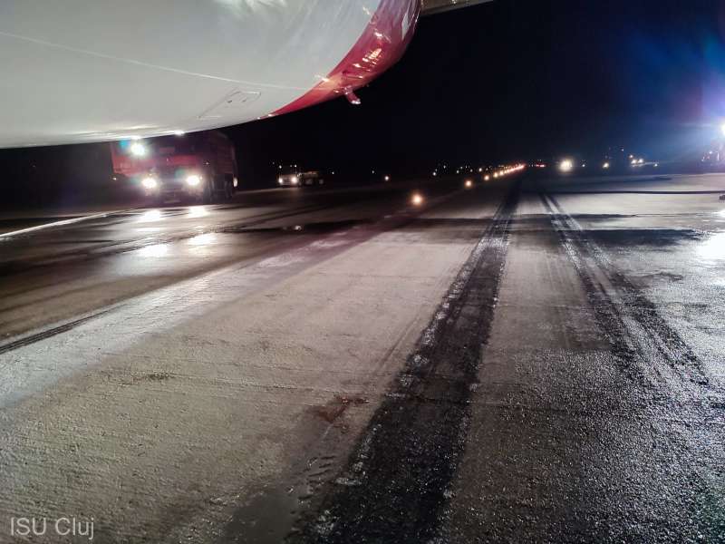 "Un avion cu incendiu la trenul de aterizare a aterizat pe pista Aeroportului internaţional din Cluj-Napoca. Incendiul a fost lichidat de către SPSU. Au fost dislocate forţe şi mijloace din ISU Cluj. Toţi pasagerii se evacuează normal. Momentan nimeni nu are nevoie de îngrijiri medicale", se arată într-o informare a ISU Cluj.