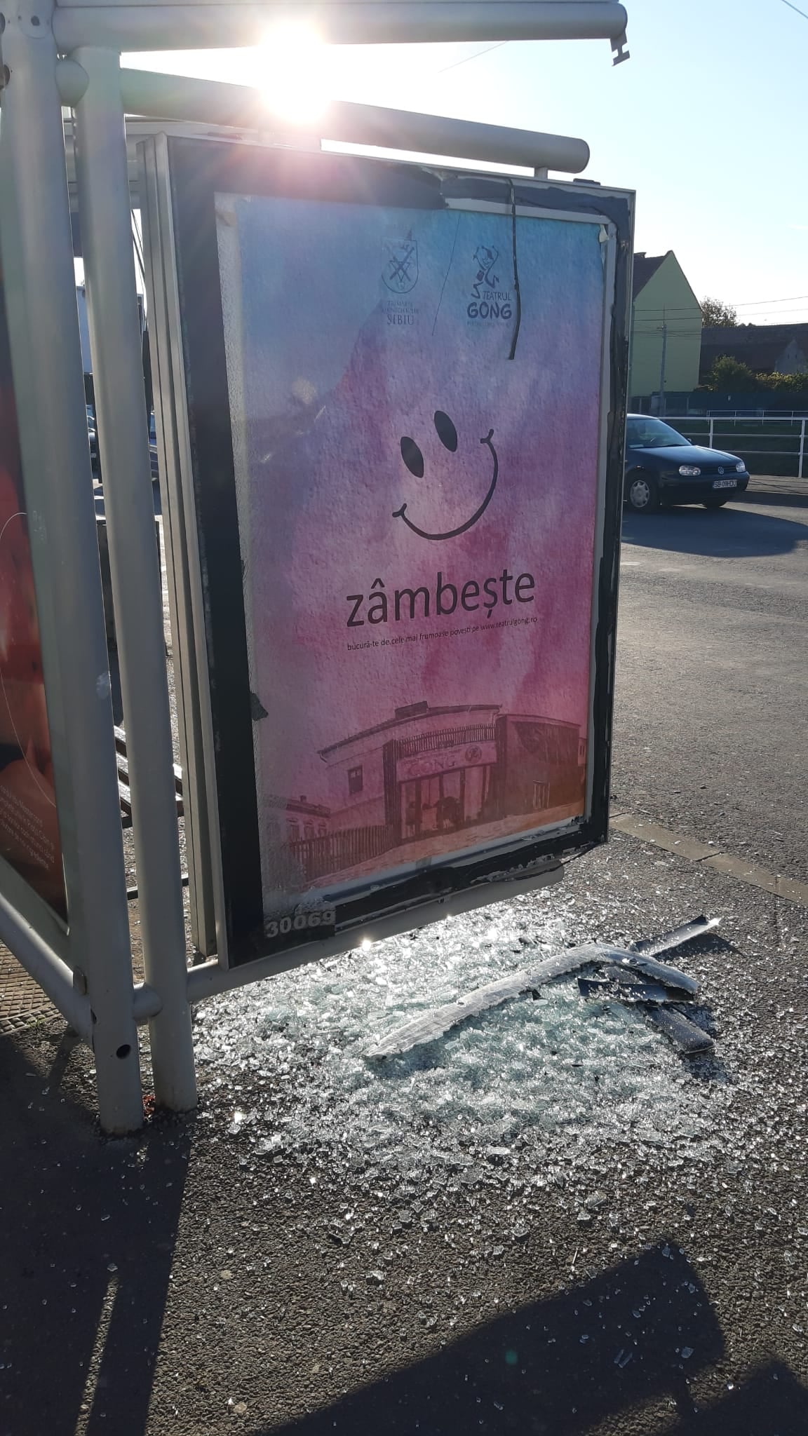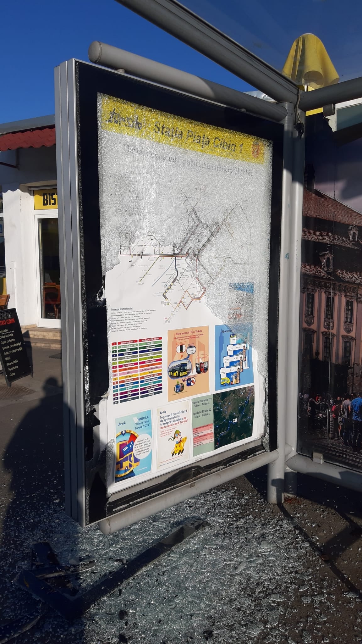"Duminică, 24 octombrie, în jurul orei 16.30 un tânăr de 27 de ani din Sibiu a distrus un panou al unei stații de autobuz din zona pieței Cibin, lovindu-l în mod repetat cu o bâtă. Camerele de supraveghere din zonă au surprins această faptă, dispecerii Poliției Locale detașând imediat două patrule care l-au reținut pe acest cetățean.