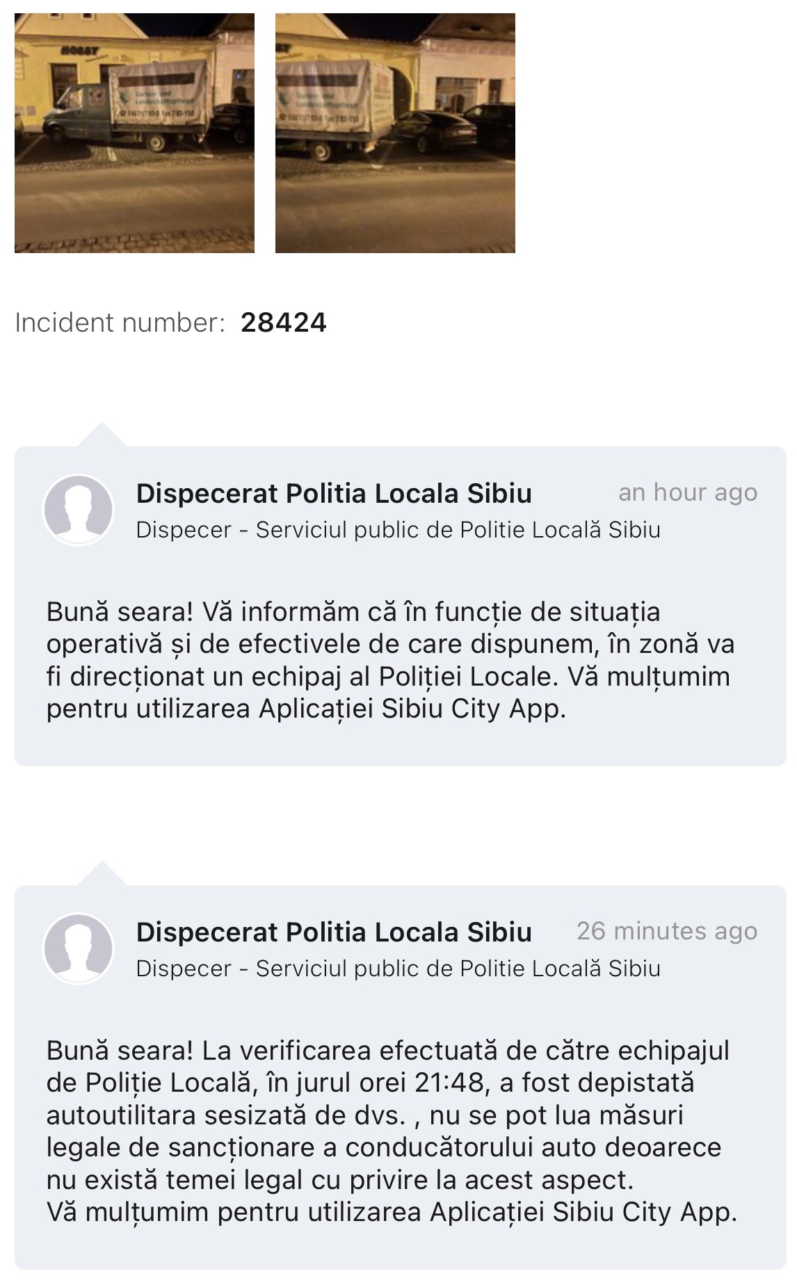 Un sibian a trimis un mail Turnul Sfatului în care semnala că a folosit aplicația Sibiu City App pentru a semnala faptul că o autoutilitară ocupă două locuri de parcare. A primit imediat răspuns că o echipă se va deplasa la locul semnalat. ”Vă informăm că în funcție de situația operativă și de efectivele de care dispunem, în zonă va fi direcționat un echipaj al Poliției Locale. Vă mulțumim”, a transmis dispecerul.