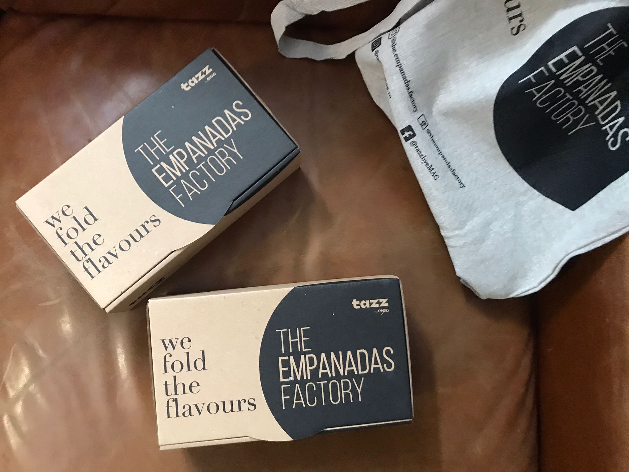Am așteptat aproximativ o oră până a venit mâncarea și am început cu dreptul, căci modul în care au fost livrate m-a surprins atât pe mine, cât și pe colegii de redacție. Au venit într-o sacoșă reutilizabilă de pânză, pe care era inscripționat The Empanadas Factory, numele restaurantului.