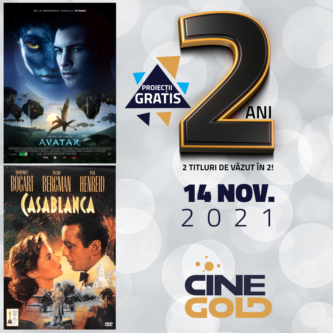 „Pe 14 noiembrie vă invităm la CineGold să sărbătorim împreună doi ani de activitate în Sibiu. Cu această ocazie facem cinste cu ACCES GRATUIT la două super-filme: Avatar și Casablanca”, transmit reprezentanții CineGold Sibiu.