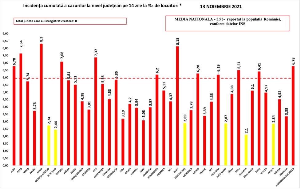 În intervalul 12.11.2021 (10:00) – 13.11.2021 (10:00) au fost raportate de către INSP 323 de decese (153 bărbați și 170 femei), din care 19 anterioare intervalului de referință, ale unor pacienți infectați cu noul coronavirus, internați în spitalele din Alba, Arad, Argeș, Bacău, Bihor, Bistrița-Năsăud, Botoșani, Brăila, Brașov, Buzău, Călărași, Caraș-Severin, Constanța, Covasna, Dâmbovița, Dolj, Galați, Giurgiu, Gorj, Harghita, Iași, Ilfov, Maramureș, Mehedinți, Mureș, Neamț, Olt, Prahova, Sălaj, Sibiu, Suceava, Teleorman, Timiș, Tulcea, Vaslui, Vrancea și Municipiul București.