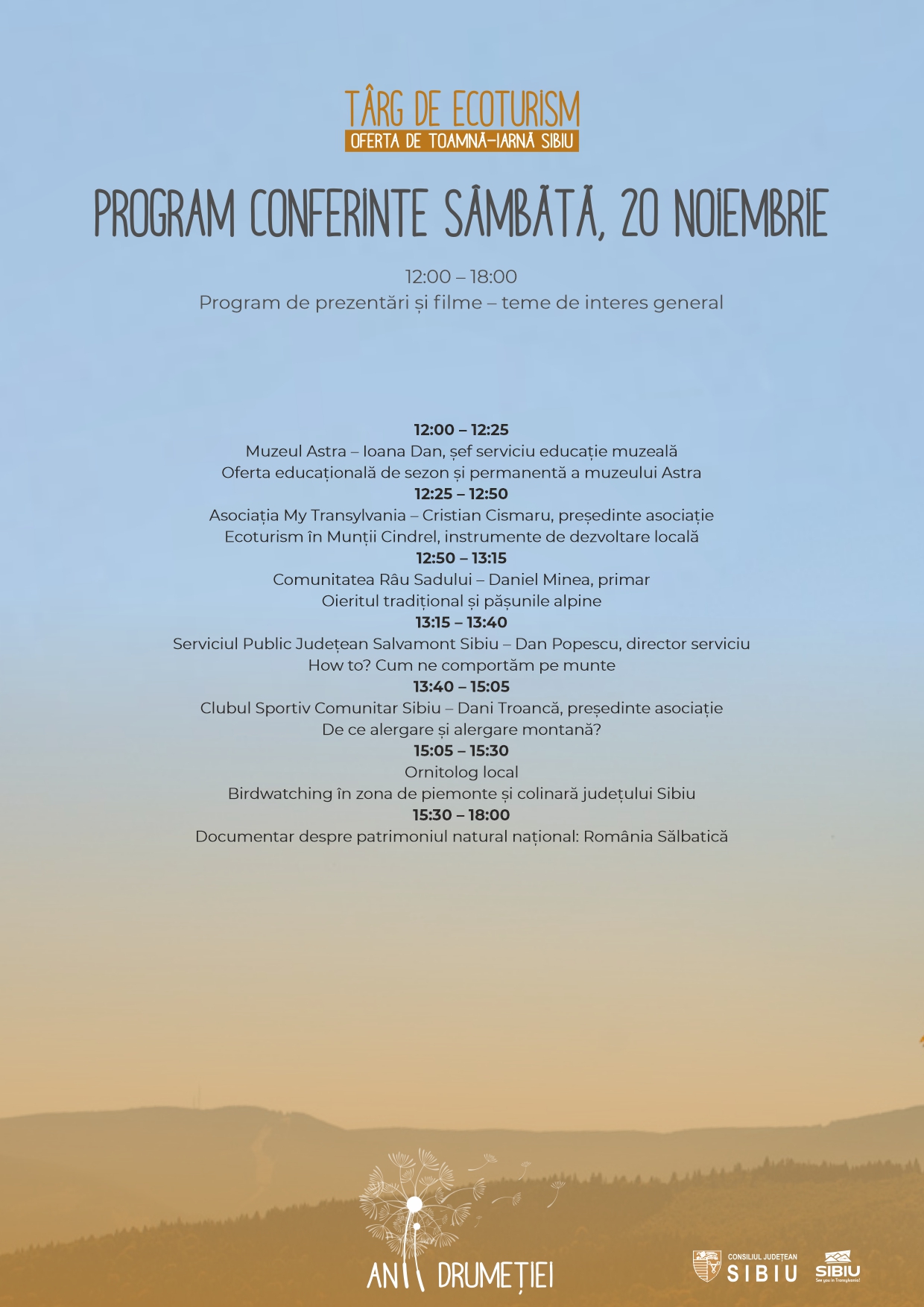 În cadrul Programului „Anii Drumeției”, Consiliul Județean Sibiu și Asociația Județeană de Turism Sibiu organizează primul Târg de Ecoturism din județ, prilej de a prezenta publicului oferta sezonului de toamnă-iarnă a activităților recreative și sportive din județ. Evenimentul va avea loc vineri și sâmbătă, în Pavilionul Muzeal Multicultural ASTRA, între orele 10:00 - 18:00.