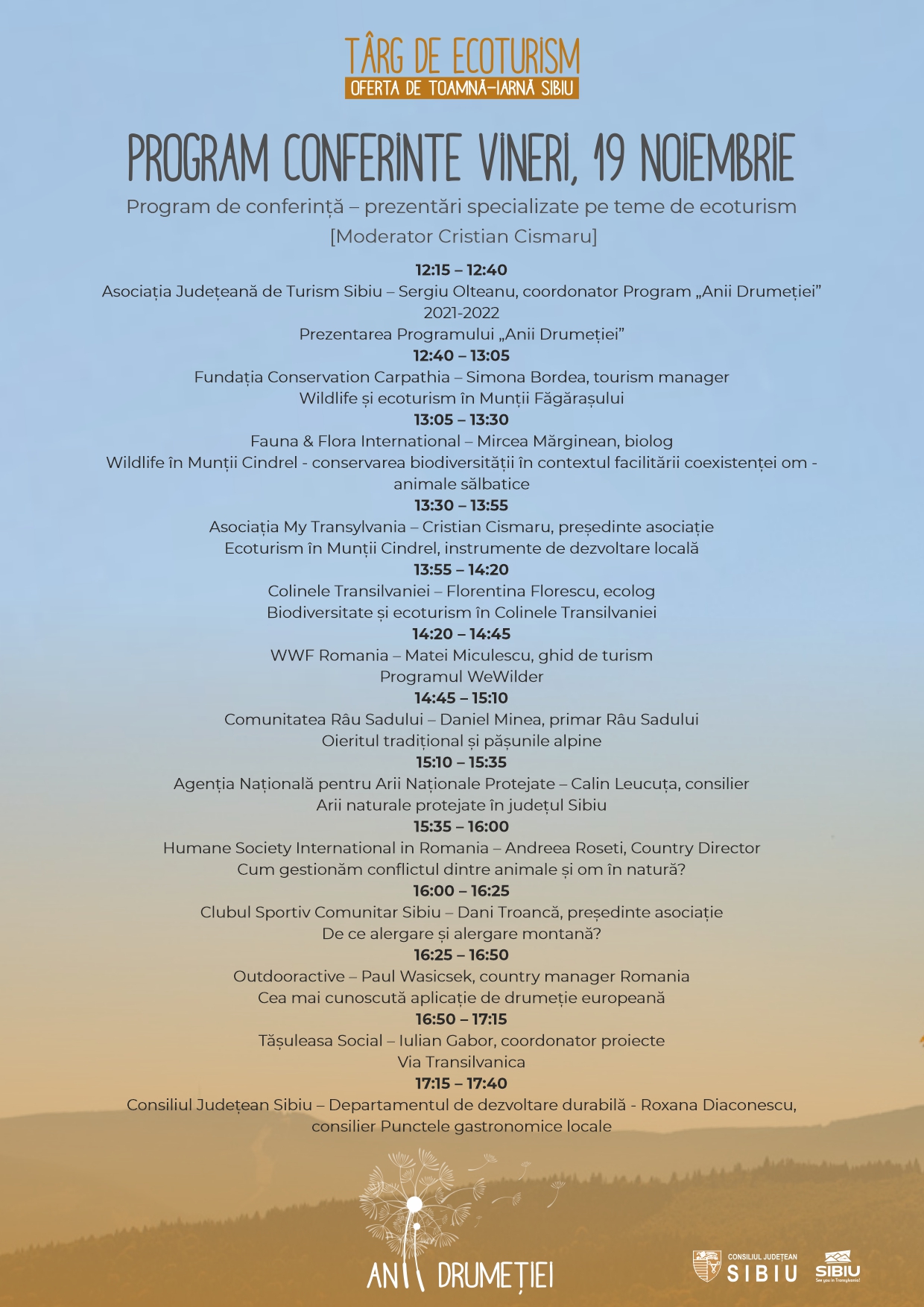 „Târgul de Ecoturism este un prilej de a expune și a aduce aproape de public toți operatorii care au în portofoliu activități și servicii care promovează turismul sustenabil. Astfel, sibienilor le va fi la îndemână să își planifice timpul liber, ținând cont de oportunitățile din județ. Activitățile în jurul cărora gravitează ideea de ecoturism sunt atât sportive, cât și recreative, iar printre ele amintesc: drumeția, drumeția cu rachete de zăpadă, schiul de tură, echitația, mountainbiking, tururile ghidate de observare a florei și a faunei, serviciile de spa, tururile culturale, dar și serviciile conexe, cum ar fi punctele gastronomice locale, facilitățile de cazare sau producătorii locali de echipament sportiv. Toate acestea pot fi explorate pe 19 și 20 noiembrie, la Târgul de Ecoturism.” declară Sergiu Olteanu, coordonatorul Programului „Anii Drumeției”.