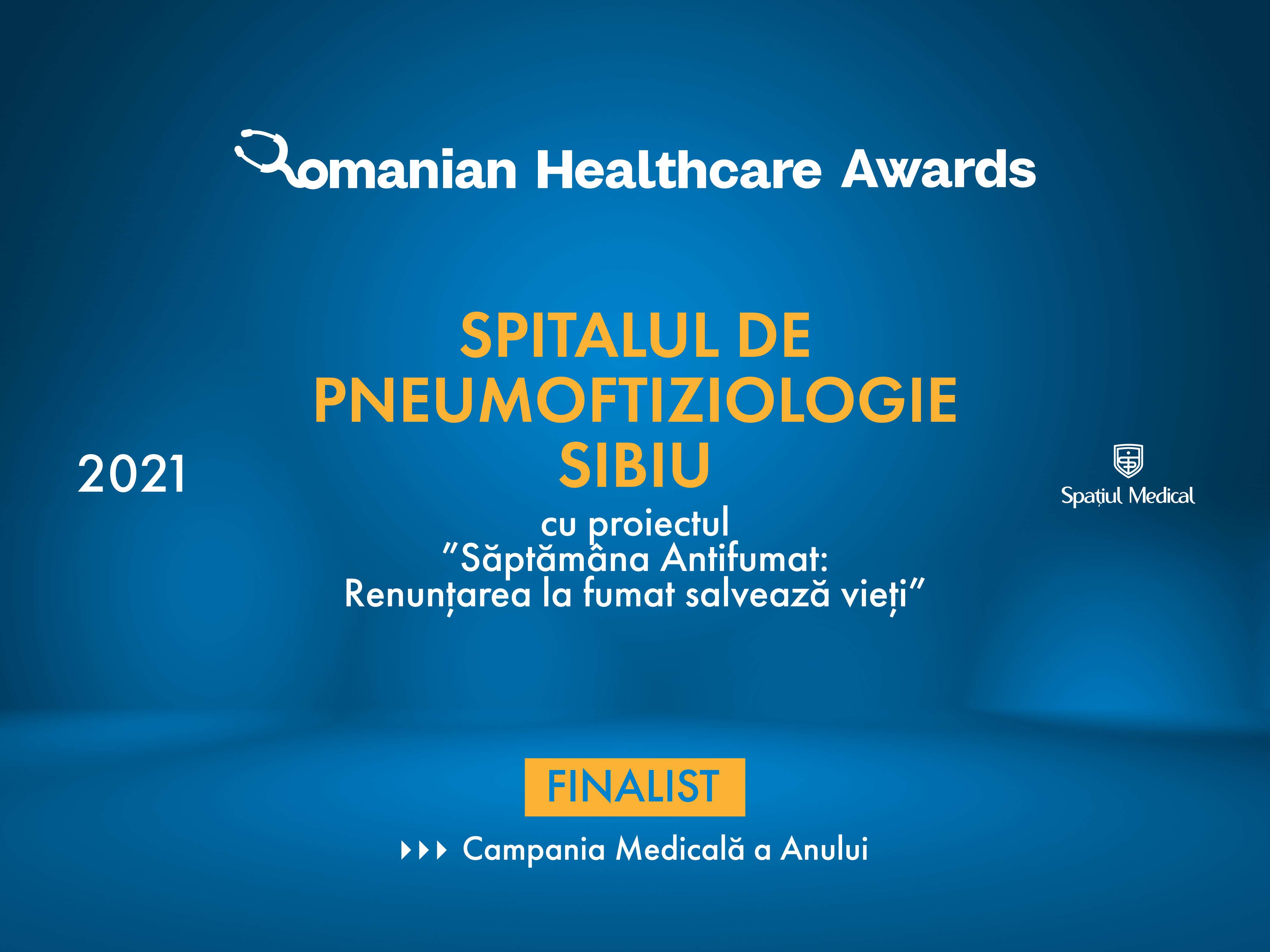 Campania „Săptămâna Antifumat. Renunțarea la fumat salvează vieți”, organizată de Spitalul de Pneumoftiziologie Sibiu este în finala Romanian Healthcare Awards, la categoria Campania Medicală a Anului. Competiția este jurizată international, cei 31 de membri ai juriului, din România, Bulgaria, Franța, Republica Moldova, Lituania, Belgia, Italia, Olanda, Irlanda și Danemarca evaluând aplicațiile la cele 7 categorii ale competiției din acest an. În final, au fost selectați câte 5 finaliști, câștigătorii fiecărei categorii urmând a fi anunțați într-o ceremonie ce va fi organizată la București, până la finele anului, în funcție de data la care va permite incidența Covid.