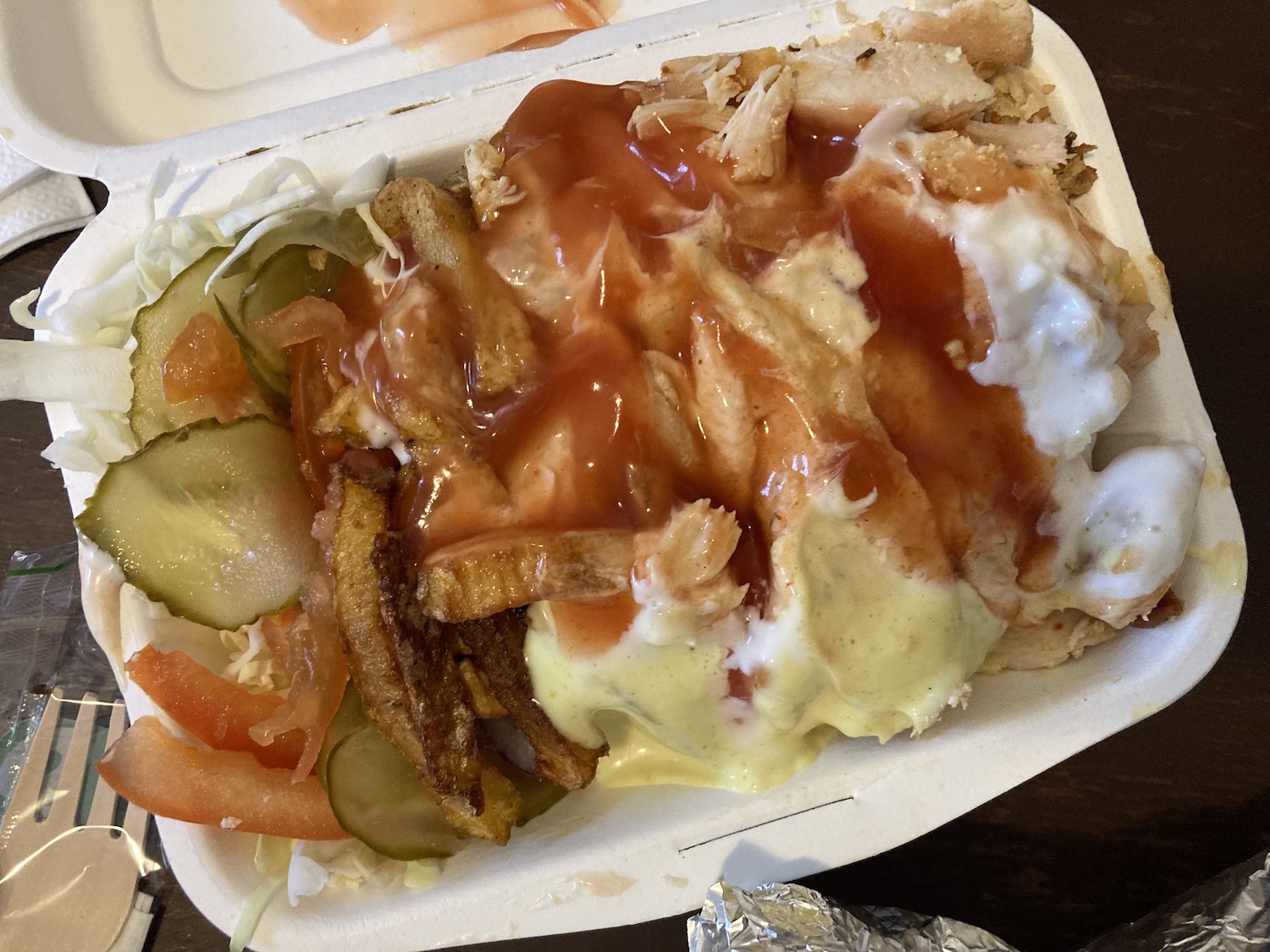Am început cu kebab-ul de pui la care, pe lângă caserolă, primisem și o pită și o furculiță din lemn. Puiul era, din punctul meu de vedere, cam uscat și mult prea fraged, se sfărâma când băgam furculița în el. În rest, a fost un preparat destul de complex și sățios. Cartofii prăjiți din interior aveau vibe-ul ăla de cartofi făcuți la disc, iar restul ingredientelor erau proaspete și se complimentau reciproc. Per total, i-aș da un 8,5, m-a deranjat consistența puiului și faptul că erau prea multe sosuri.