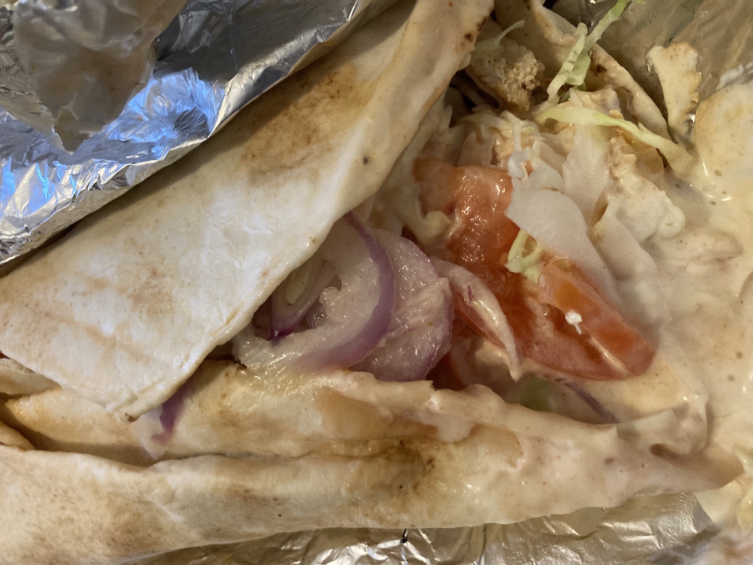 Shaorma a fost altă poveste. Bună la gust, dar și mai îmbibată în sosuri decât kebabul. Iar faptul că era și încărcată până la refuz a făcut procesul de a o mânca cu atât mai dificil - am făcut sos peste tot, multe ingrediente căzute pe lângă și decizia ca, la final, să mănânc o parte din shaorma cu furculița. Îi dau nota 8, pentru toată mizeria pe care am făcut-o în jurul ei și pentru excesul de sos.