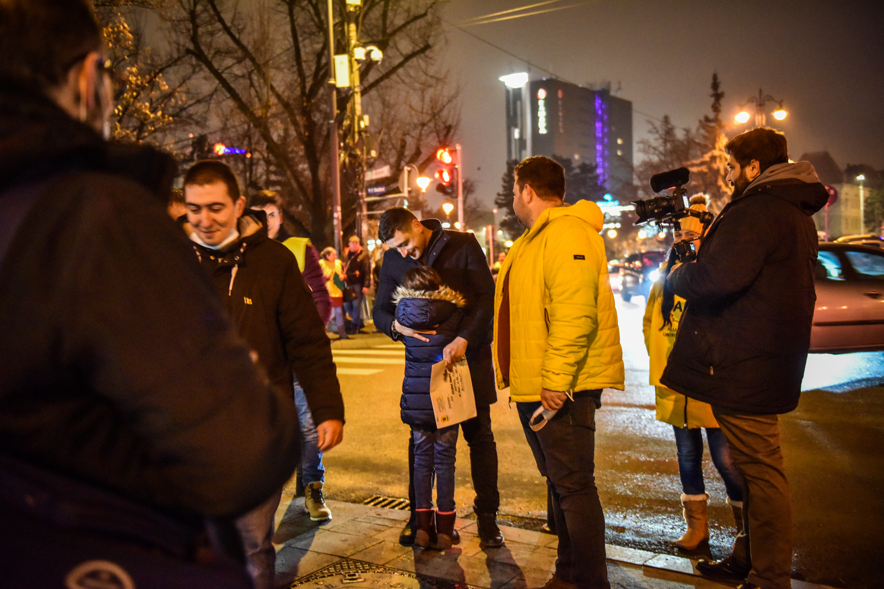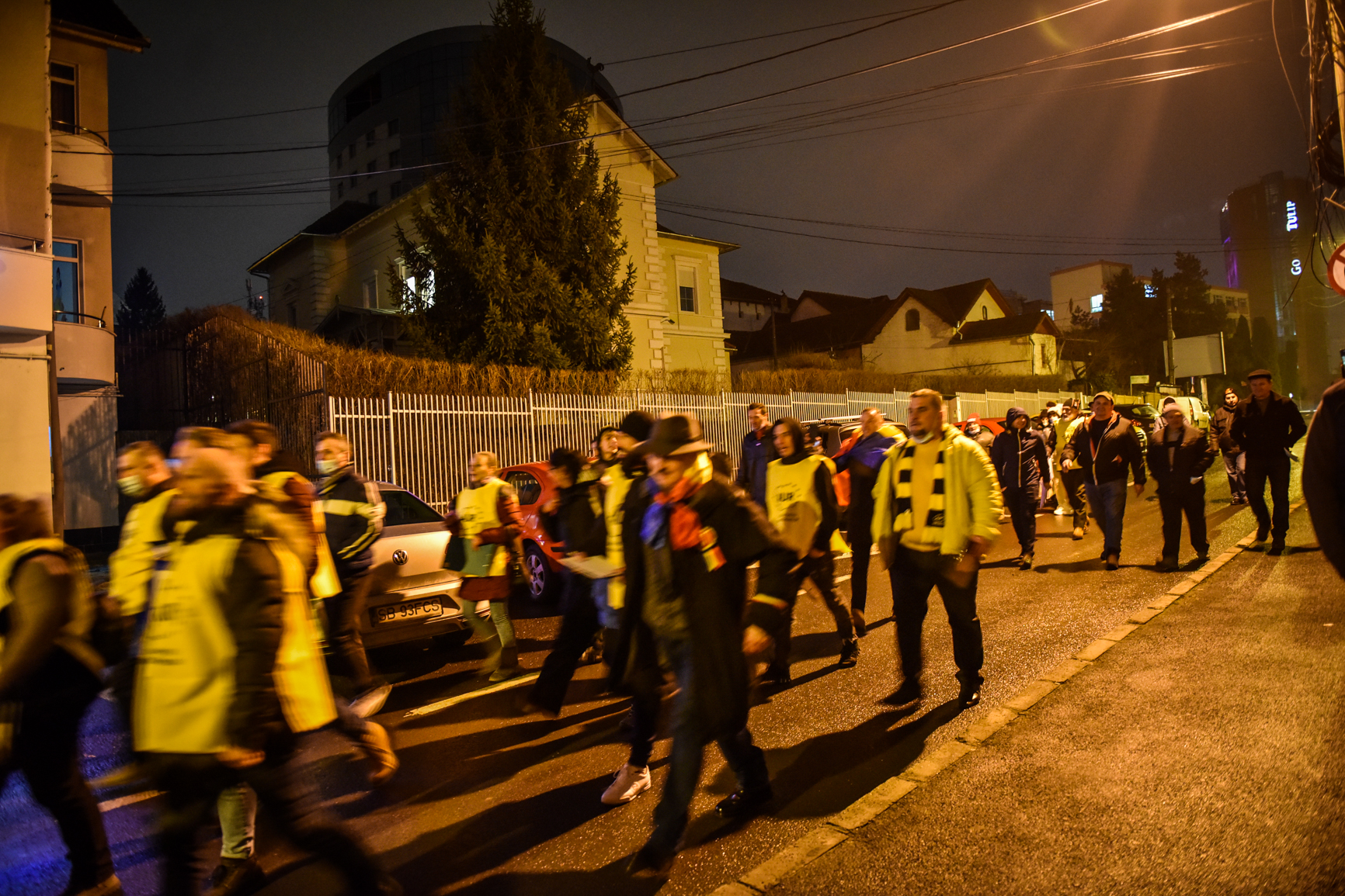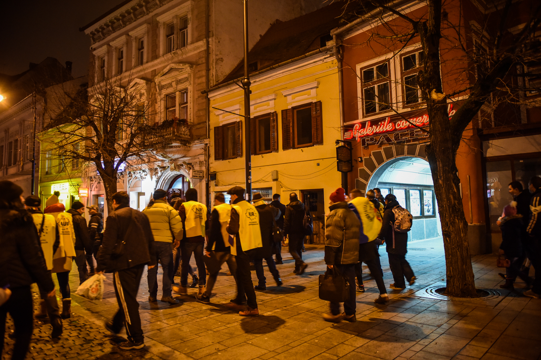 Sunt vreo 40 de oameni de partid care grăbesc pasul ieșind de pe bulevardul Mihai Viteazul și încolonându-se pe trotuarul mult mai îngust de pe Calea Dumbrăvii. În dreptul sediilor procurorilor sibieni, încep și scandările. Multe din repertoriul de acum cinci ani, când pe aceeași Cale a Dumbrăvii zeci de mii de sibieni strigau ”România, trezește-te!”. Între timp, traseul a devenit clar: va fi o oprire la unul din imobilele lui Iohannis, cel de pe strada Someșului.