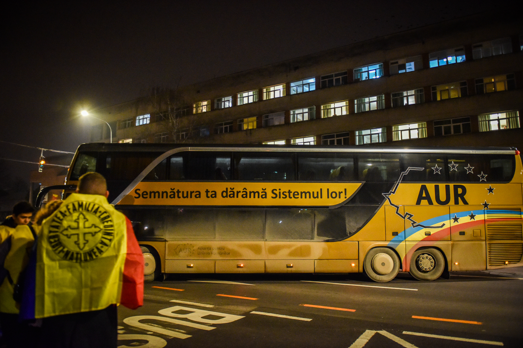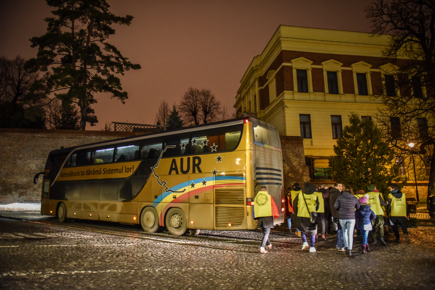 Cu o jumătate de oră întârziere față de ora anunțată, apariția autocarului cu două niveluri pe bulevardul Mihai Viteazul din Sibiu animă spiritele la cortul pe care AUR l-a instalat vizavi de biserica impunătoare din zonă. Membrii de partid sar să mute mașinile parcate strategic de dimineață pentru a face loc acum autocarului.