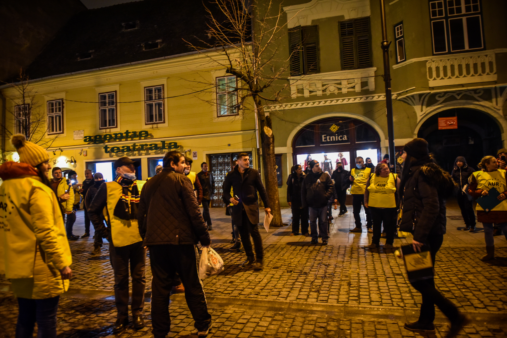În aproximativ o oră, din agitație n-au mai rămas decât postările pe Facebook. Plus o mașină a poliției locale, probabil în căutarea celor care au pornit în marș prin Sibiu.