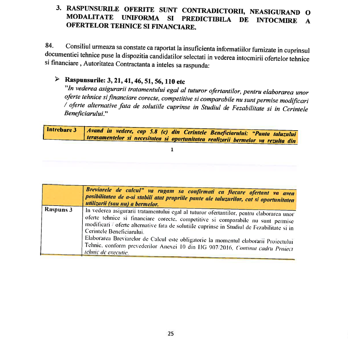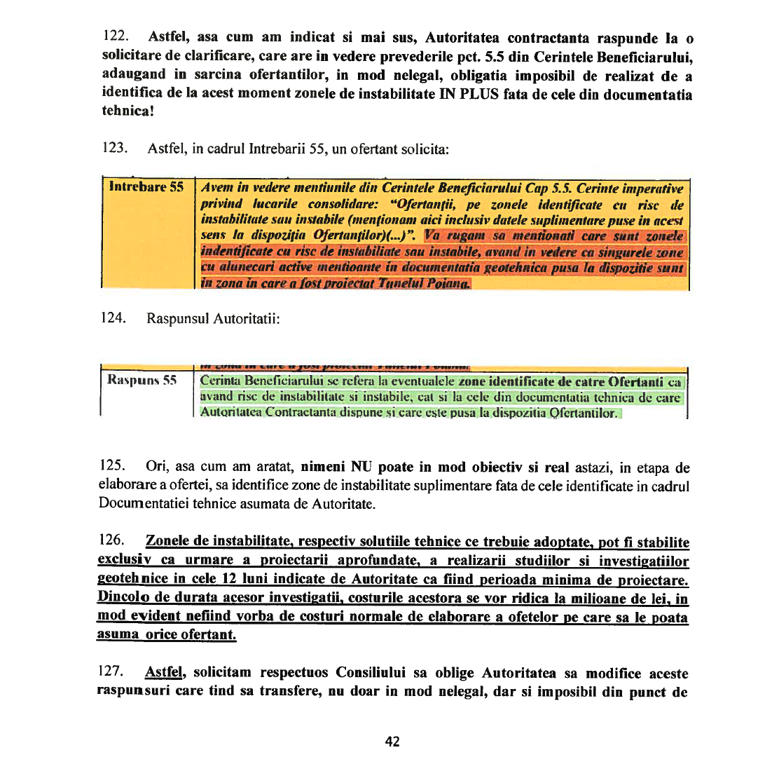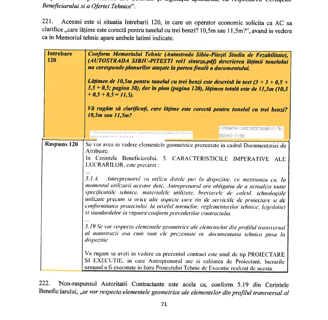 ”Ce reclamă constructorii? "Profesionalismul" comisiei de evaluare care dă răspunsuri la cererile de clarificări în bătaie de joc, pline de truisme și contradicții care mai mult creează confuzie în loc să lămurească problema. Sau faptul că "documentația" oferită de CNAIR are un foraj cu coordonatele unui lac aflat la 30 km distanță față de traseu. Ori că un studiu geotehnic are doar... coperta! Sau că la Tunelul Poiana, lung de 1,7 km, studiul de fezabilitate din 2008 are doar două foraje, în capete, la o adâncime de 18 metri când autostrada străbate muntele la sub 100 metri, iar normativul cere 9 foraje, minim. Ne-ar trebui câteva pagini doar să spicuim cele mai aberante răspunsuri date de CNAIR și cele mai grave abateri de la normative și lipsuri ale studiilor de teren pe care antreprenorii sunt nevoiți să își fundamenteze o ofertă solidă care să fie și pusă în operă, în realitate, nu doar pe hârtie”, scrie sursa citată.