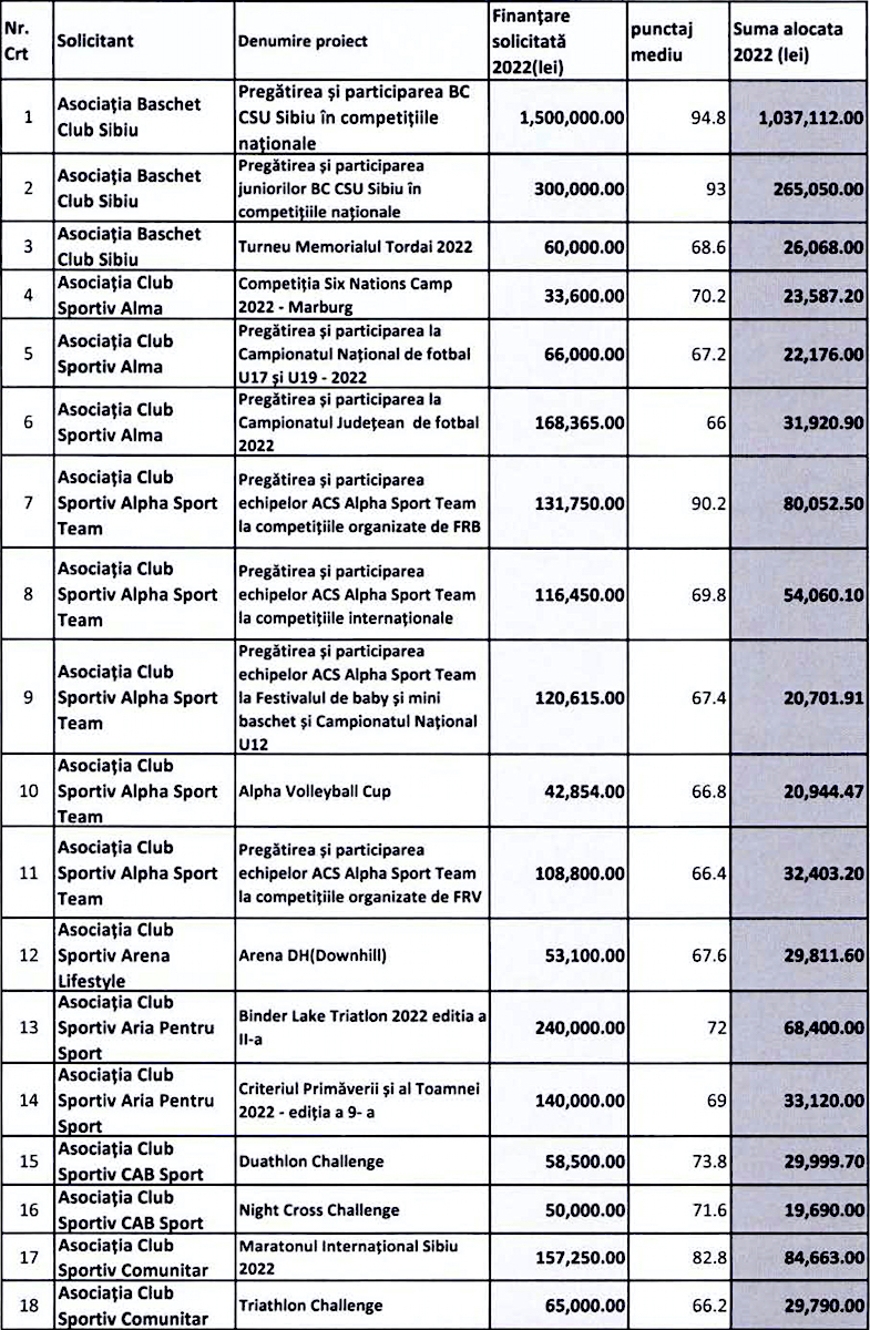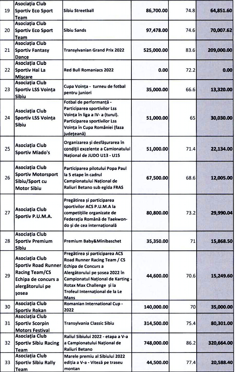 Conform listei propusă consilierilor locali spre vot, finanțări mai relevante sunt propuse pentru Raliul Sibiului (320.000 de lei), pentru susținerea echipei de juniori a CSU Sibiu (265.000 de lei), concursului de dans Transylvanian Grand Prix (209.000 de lei), susținerii echipei de fotbal Inter Stars (124.000 de lei) și pentru baschetbaliștii de la Alpha Sport Team (134.000 de lei, prin două proiecte).