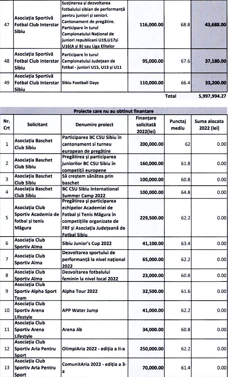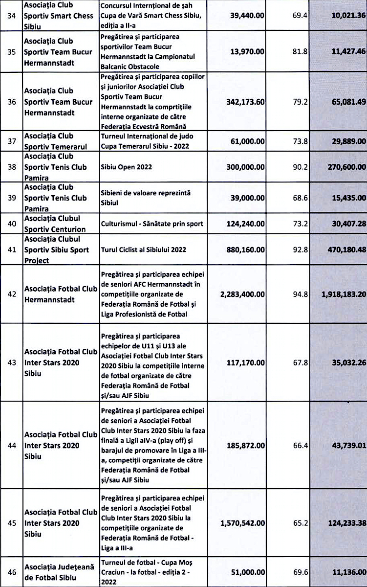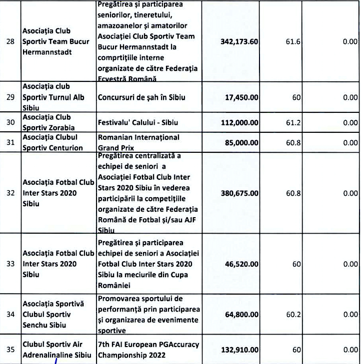 Primăria Sibiu a dat publicității propunerile de alocări de fonduri prin Agenda Sportivă pentru anul în curs. Este vorba de 84 de proiecte declarate eligibile (care au întrunit minim 60 de puncte conform grilei din Ghidul de finanțare). 35 dintre acestea, însă, nu vor primi niciun leu. ”Raportul final și alocarea sumelor s-au făcut cu respectarea prevederilor Ghidului menționat mai sus, avându-se în vedere prevederile [acestuia -n.r.] şi anume că: „NU toate propunerile care vor întruni punctajele minime necesare vor putea primi finanțare( ... ), alocarea sumelor făcându-se în limita bugetului disponibil la momentul aprobării. Finanțarea aprobată poate fi aceeași sau mai mică decât cea solicitată”, justifică funcționarii administrației locale.