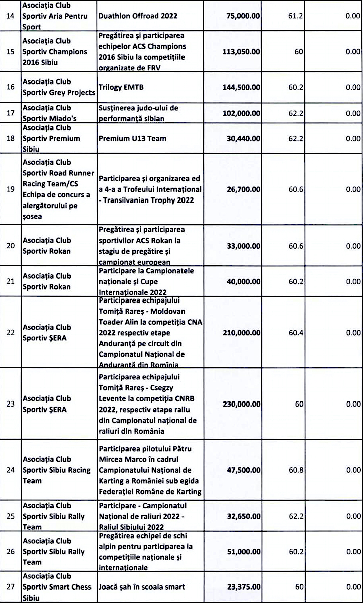 Finanțări sub 100.000 de lei sunt propuse Maratonului de la Sibiu (84.000 de lei), Triatlonului de la Lacului din Binder organizat de Aria pentru Sport (68.000 de lei), concursului Sibiu Streetball (64.000 de lei), a celui denumit Sibiu Sands (70.000 de lei) și, respectiv, Asociației Club Sportiv Team Bucur pentru competițiile ecvestre (76.000 de lei, pentru două proiecte).