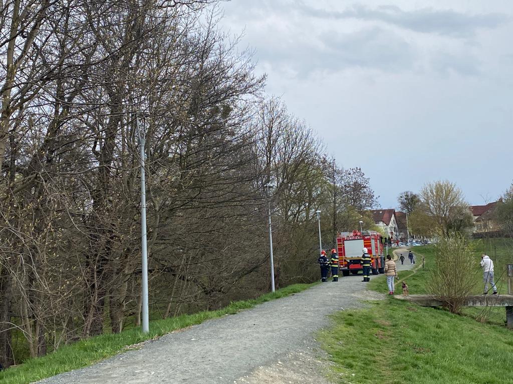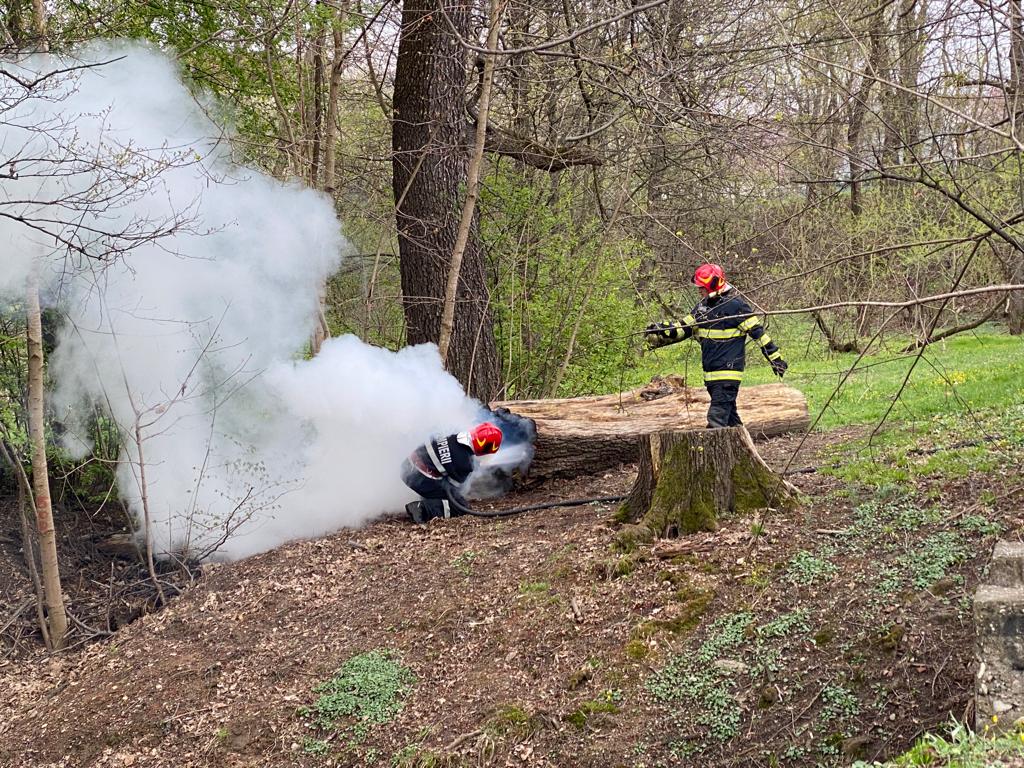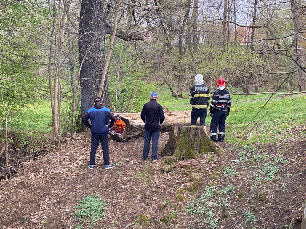 Un echipaj de pompieri a intervenit în parcul Sub Arini, unde un copac doborât a fost incendiat.