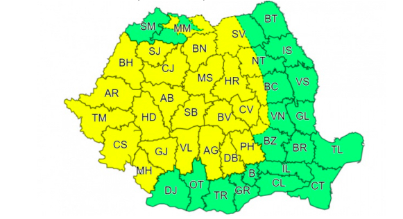 Administrația Națională de Meteorologie a transmis miercuri o atenționare de tip cod galben valabilă pentru întreg județul Sibiu.