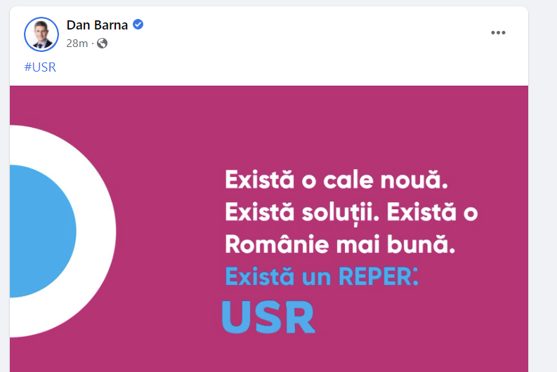 "Există o cale nouă. Există soluții. Există o Românie mai bună. Există un Reper: USR" este mesajul "adaptat" postat de Dan Barna online.