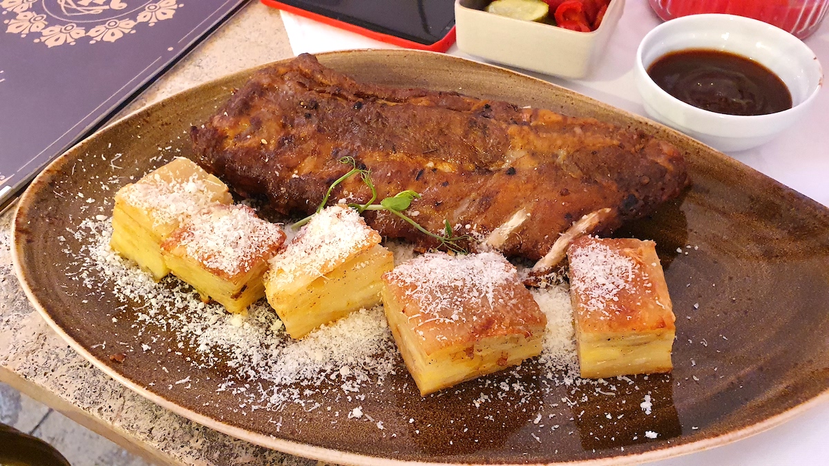 Alături de mine, progenitura-mi a devorat coastele de porc botezate ”famous ribs «St. Louis style», promise prin meniu a fi gătite domol la cuptor și ușor afumate, fiind însoțite de millefoglie de cartofi cu brânză maturată, un sos de barbeque cu prune uscate și câteva murături.