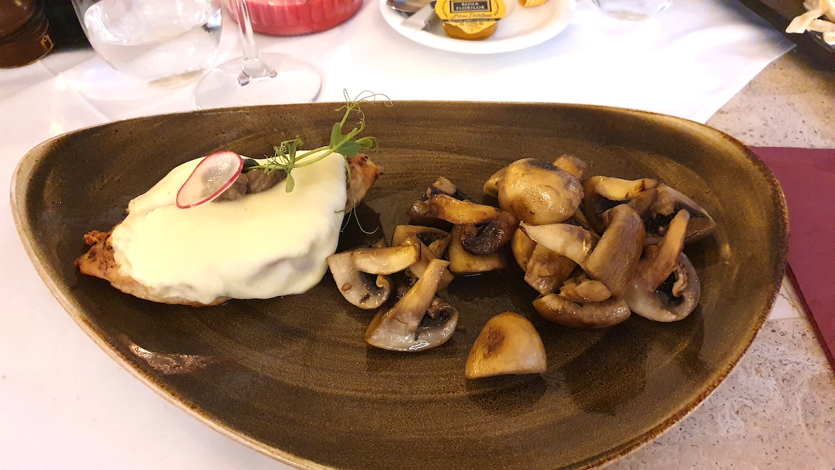 O surpriză mai mare a fost pieptul de pui cu trufe și brânză maturată. Gătit la cuptor pe cărbuni, puiul avea o plăcută aromă de fum, trufele negre și-au impregnat din plin aroma în stratul de brânză de de-asupra, ciupercile cu usturoi întregind foarte plăcut experiența.