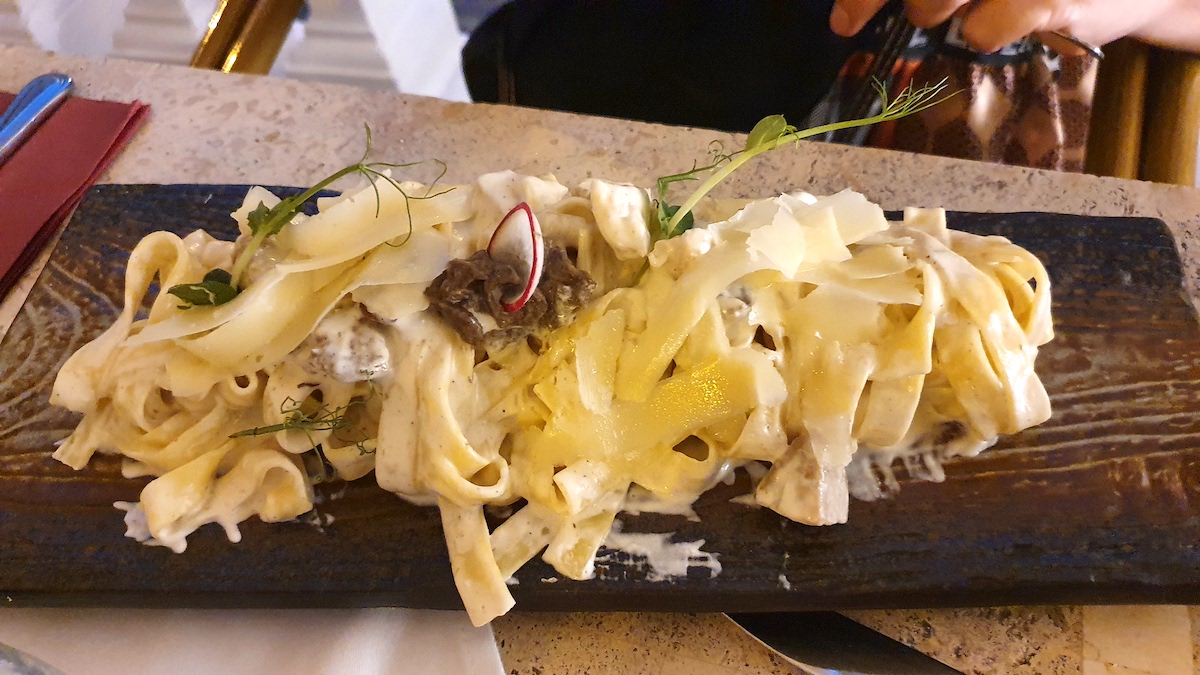 Singurul preparat care, pur și simplu, ”n-a mers” au fost tagliatellele cu hribi și trufe negre. Deși pastele erau promise a fi făcute ”de casă”, ceva lipsea (inclusiv aroma de trufe) din gustul preparatului. L-am cerut a ne fi împachetat pentru acasă, dar nici a doua zi nu s-a dovedit mai breaz.