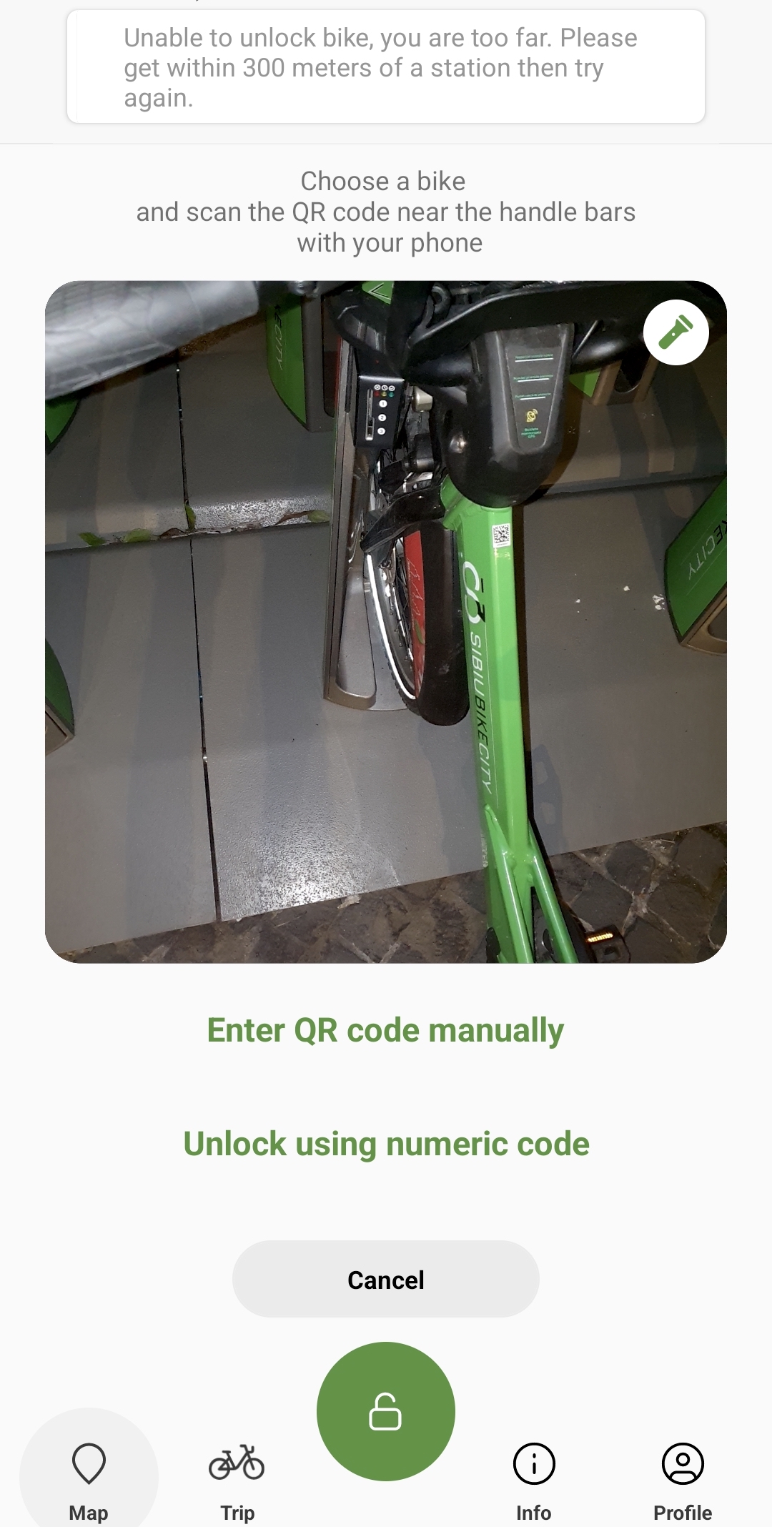Într-o seară doar una din cele opt biciclete disponibile am putut debloca. Asta după numeroase mesaje de eroare, printre care și cel de mai sus, în care eram atenționat că mă aflam la peste 300 de metri de stație și de aceea nu mi se permitea să deblochez o bicicletă