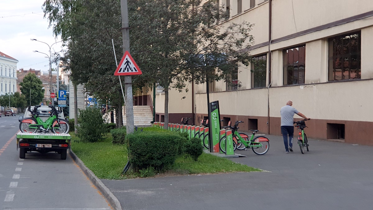 În fiecare zi, în Sibiu bicicletele sunt relocate în stații în funcție de gradul acestora de încărcare.