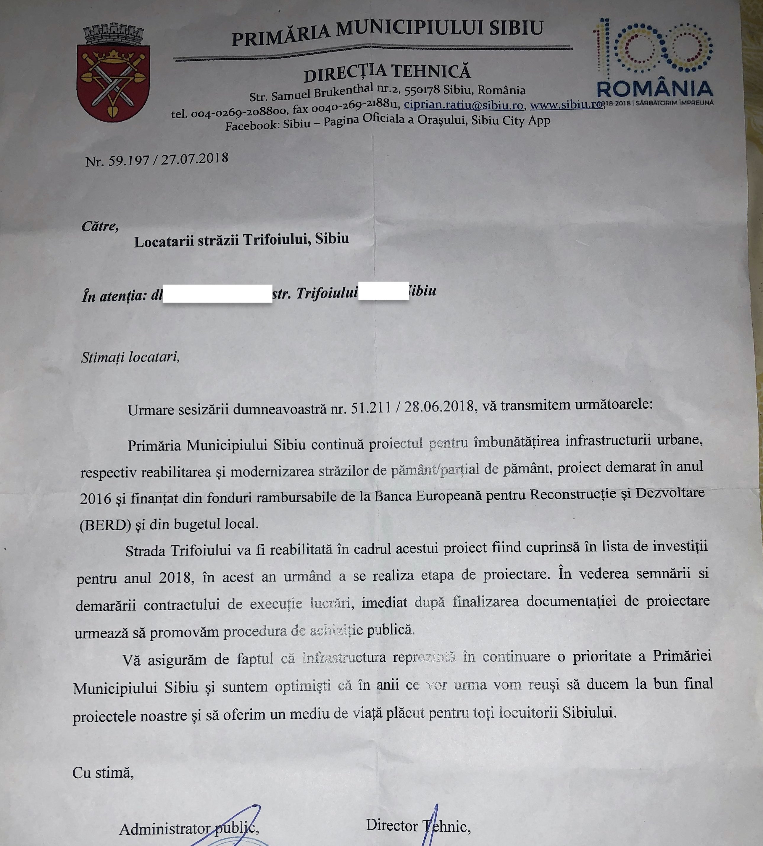 Iată ce răspundea municipalitatea la sesizarea locatarilor, solicitare datată 28 iunie 2018:
