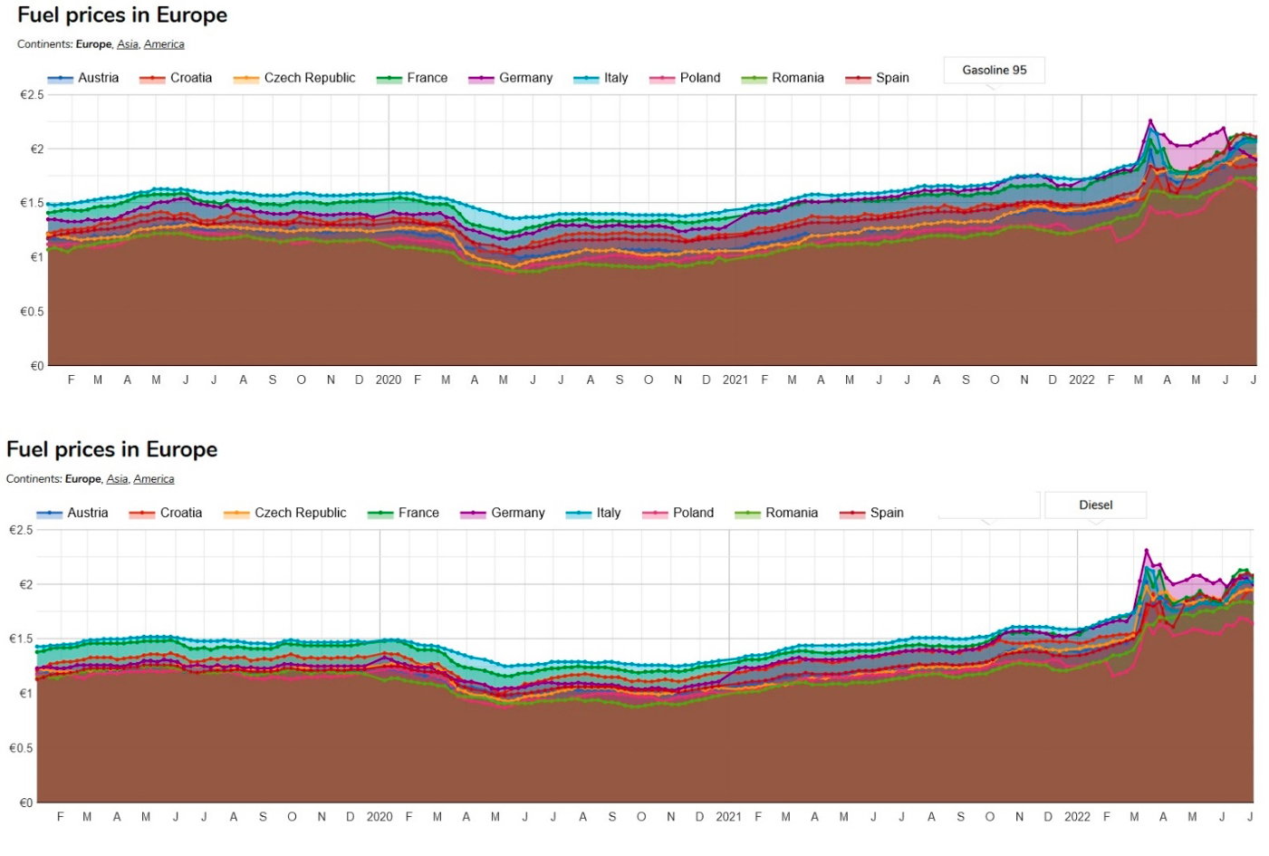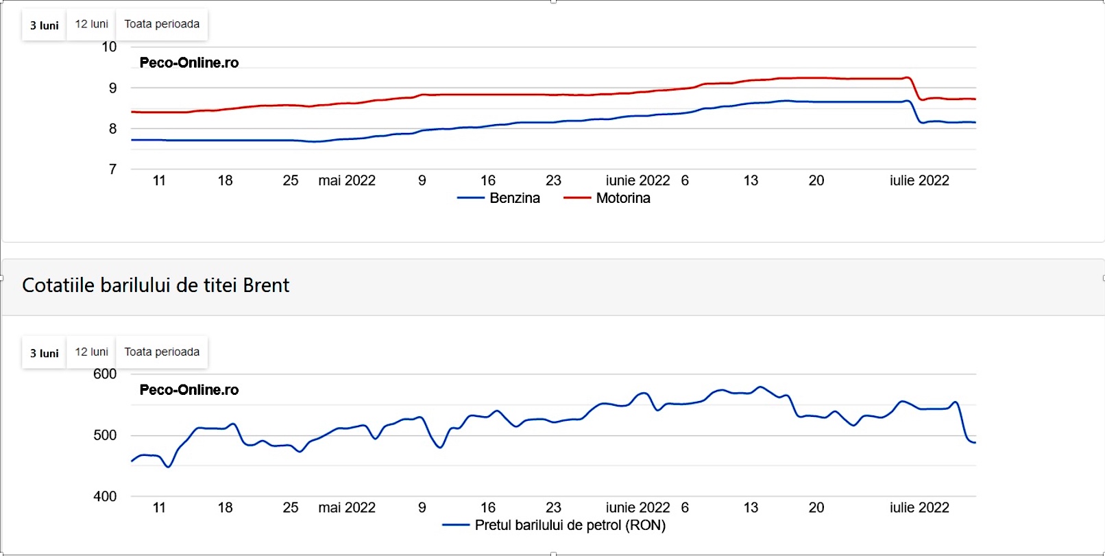 Așa cum declaram zilele trecute „mă aștept la scăderea prețului la pompă în România”, astăzi prețul la pompele din România a scăzut, în trend cu scăderea cotaților din această săptămână pentru țiței (8%) și a cotaților la benzină (9%). Astfel, cel mai mic preț conform platformei peco-online în București este de 8,06 lei litru (benzină), respectiv cu 0,59 lei/litru (7%) sub prețul din 30 iunie 2022, o parte urmare a acțiunii Guvernului și altă parte datorită acțiunii furnizorilor.