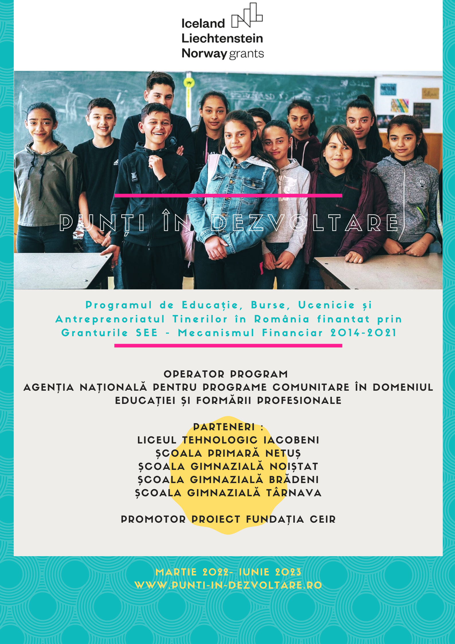 Fundația CEIR implementează proiectul cu numele "Punți în dezvoltare", nr. 2021- EY-PICR-0005, proiect realizat cu sprijinul financiar primit prin Granturile SEE 2014-2021 în cadrul Programului de Educație, Burse, Ucenicie și Antreprenoriatul Tinerilor, ce urmărește să genereze o multitudine de efecte pozitive și de lungă durată în școlile partenere, dar și asupra persoanelor implicate direct sau indirect în activități. Proiectul se desfășoară între lunile martie 2022 – iunie 2023 în cinci unități școlare partenere din județul Sibiu: Liceul Tehnologic Iacobeni, Școala Gimnazială Târnava, Școala Gimnazială Brădeni, Școala Primară Netuș, Școala Gimnazială Noiștat, care au un procent de minimum 20% de elevi înscriși de etnie romă.