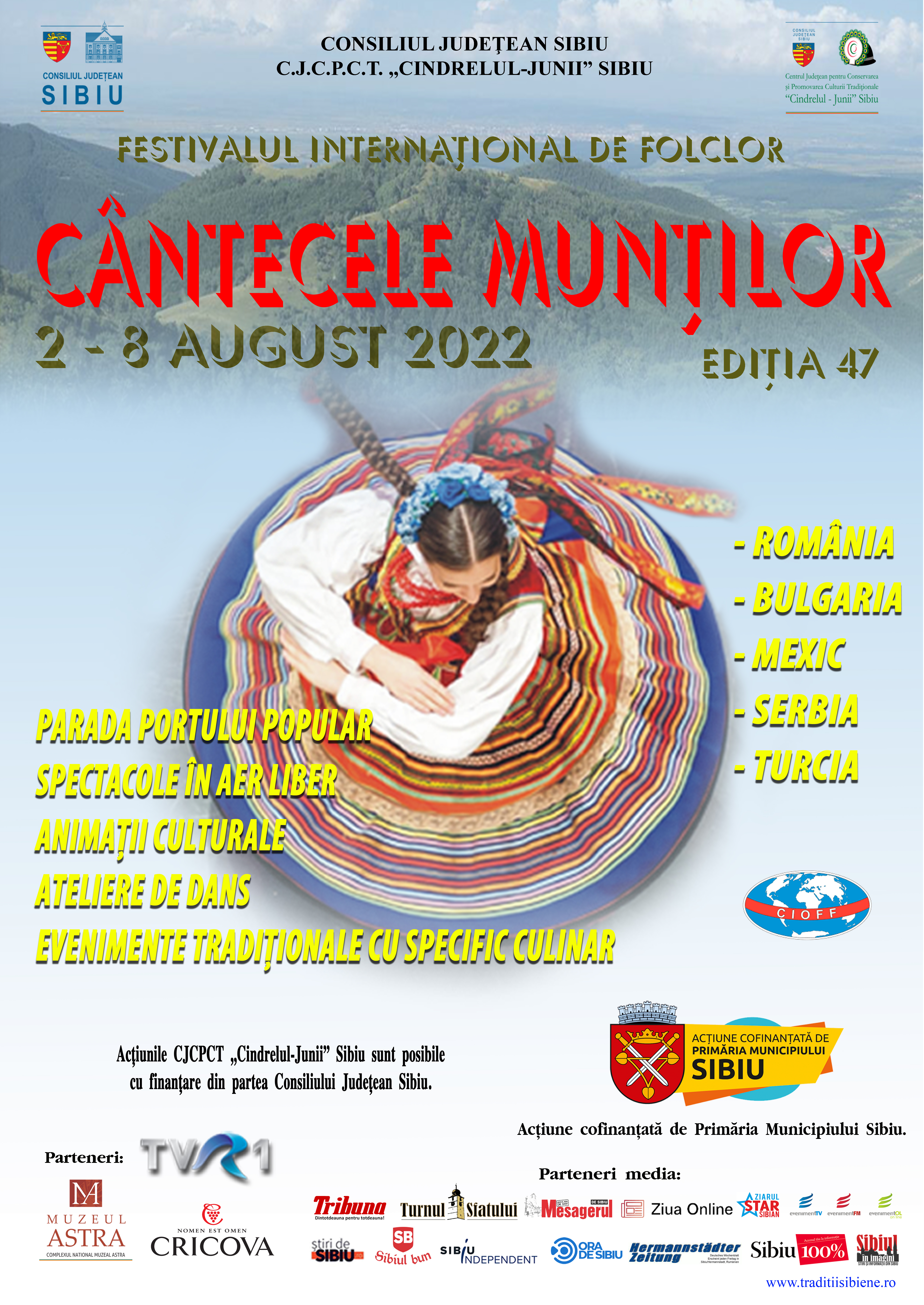 Cu dansuri și cântece populare, cu obiceiuri și preparate culinare vom sărbători cultura tradițională din America, Asia și Europa, la cel mai mare și mai vechi festival de folclor al municipiului Sibiu: „Cântecele Munților”, organizat în 2-8 august 2022, de Consiliul Județean Sibiu și Centrul Județean pentru Conservarea și Promovarea Culturii Tradiționale „Cindrelul - Junii” Sibiu.