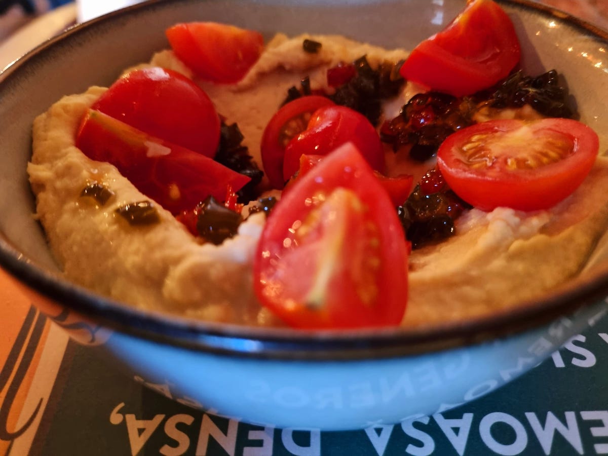 Am cerut din meniu un humus cu dulceață de ardei iute, babgulyás, paste cu trufe și penne arrabiatta. Precum și o bere la draft, dacă tot suntem într-un pub și un Aperol spritz. Le luăm pe rând.