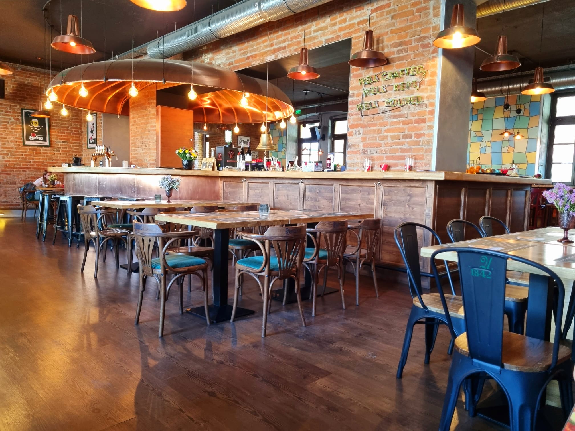 Spațiul pare modern, înclină clar spre un pub, așa cum îi spune și numele, singura chichiță pe care nu o înțeleg e cupola de cupru de deasupra barului care arată fix ca o ciupercă și nu pare să se lege cu nimic altceva. M-am gândit că poate fi hotă, însă bucătăria nu e acolo. Pare puțin scoasă din peisaj, din punctul meu de vedere, în rest totul e făcut cu gust.