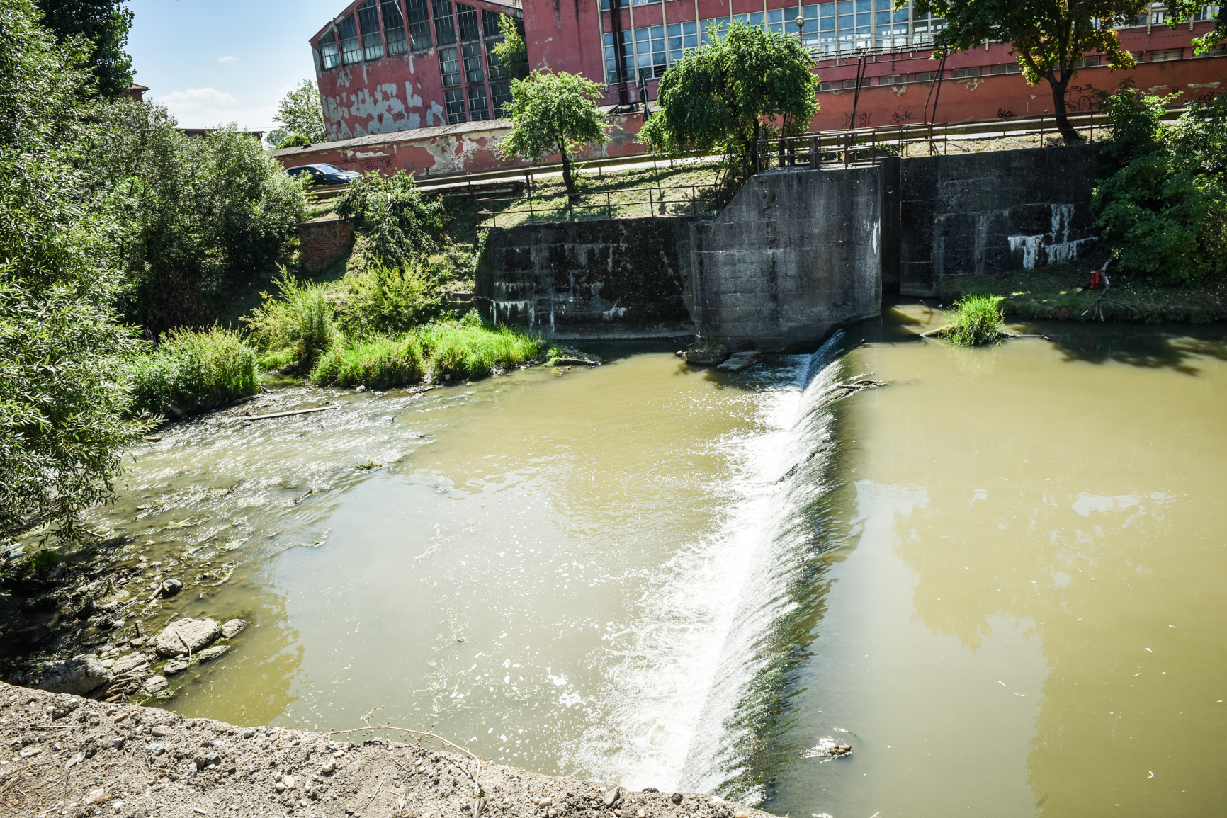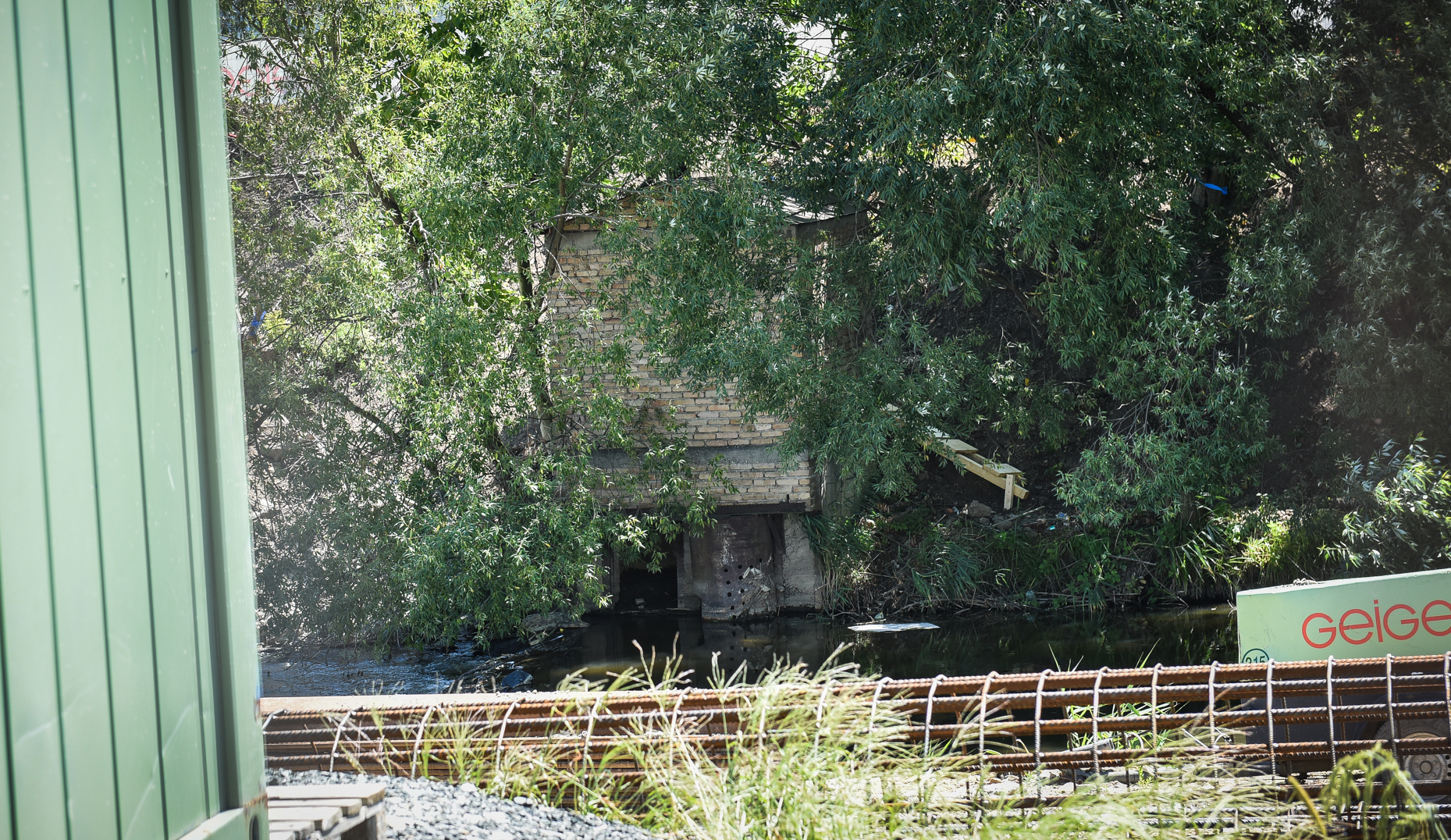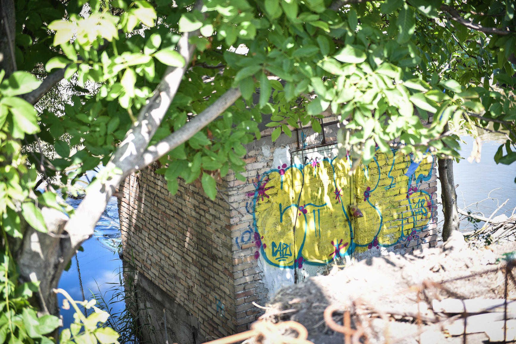 Acoperită de vegetație și graffiti, priza de apă este încă vizibilă