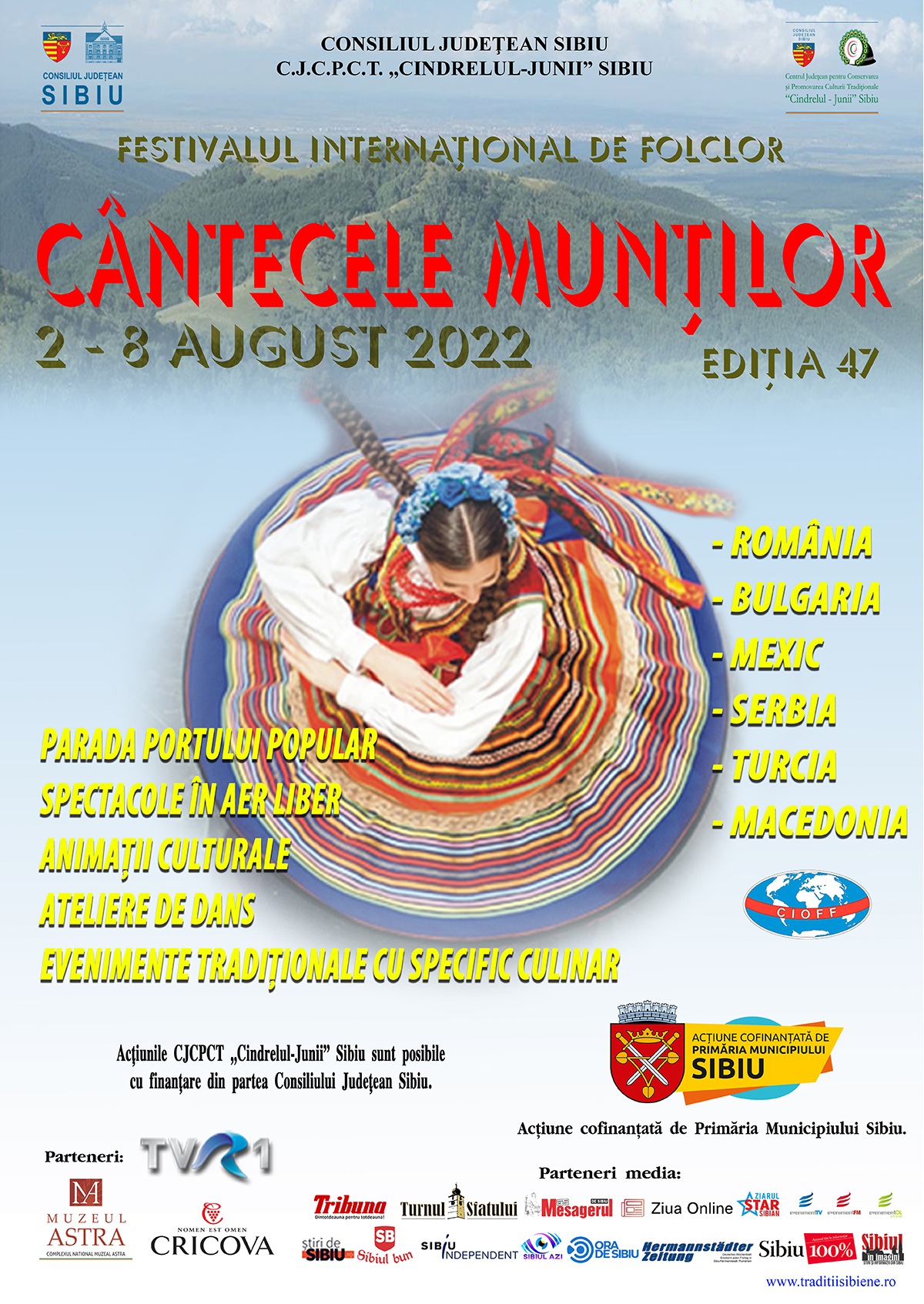 Cu cântece și jocuri populare din Europa, Asia și America petrecem această săptămână la Festivalul Internaţional de Folclor „Cântecele Munților”, organizat de Consiliul Județean Sibiu și Centrul Județean pentru Conservarea și Promovarea Culturii Tradiționale „Cindrelul - Junii” Sibiu; acțiunea este cofinanțată de Primăria Municipiului Sibiu.