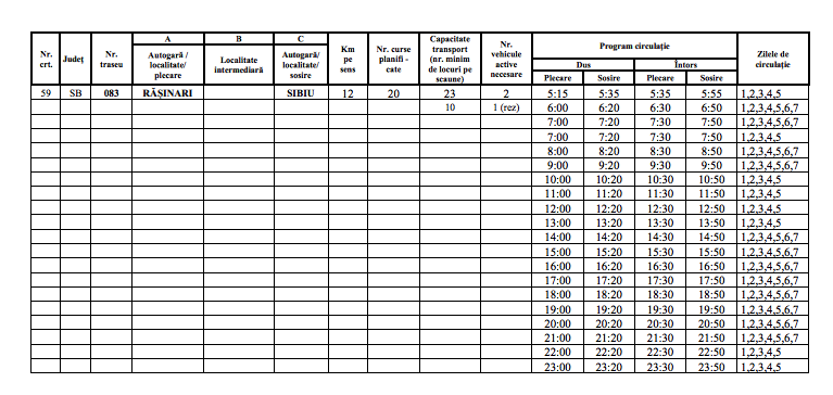 Prin adresa înregistrată la Consiliul Județean, operatorul de transport rutier Societatea Gospodărire Comunală Locală Rășinari S.R.L. a solicitat modificarea graficului de transport pentru traseul 083 Rășinari – Sibiu, traseu atribuit în baza contractului de delegare a gestiunii serviciului de transport public județean de persoane prin curse regulate.