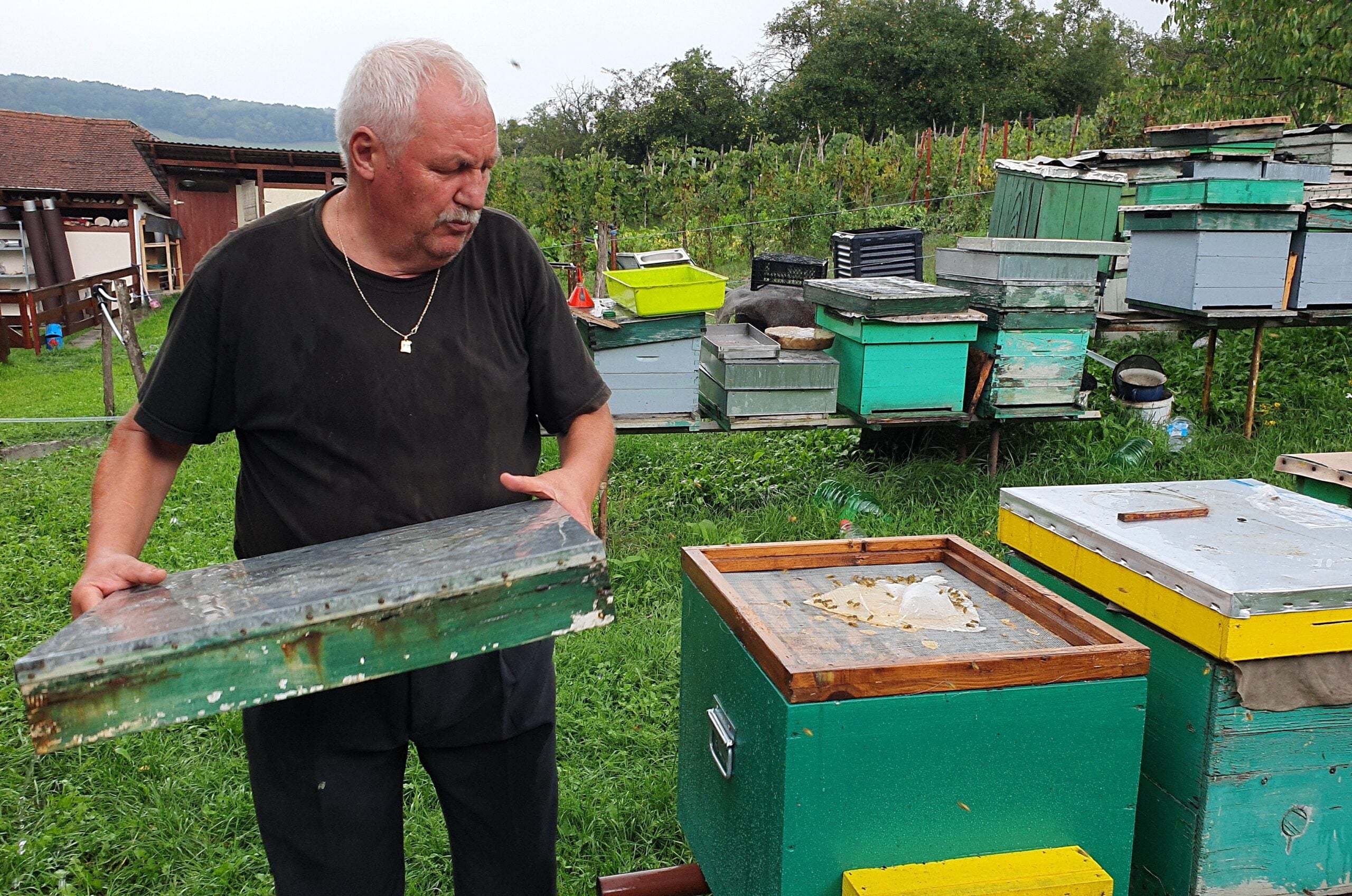 Și vedem stupii cu albine de care Laci (așa ne-a cerut să-i spunem) povestește cu pasiune, de ursul care a venit în câteva rânduri aici, de lucrurile care au ieșit din mâinile sale prin toată gospodăria cu flori multe și toate la locul lor. De n-ai zice că e doar o casă de vacanță. ”Deocamdată”, zice Laci, care are de gând să se retragă la pensie în satul care acum are sub 100 de locuitori.