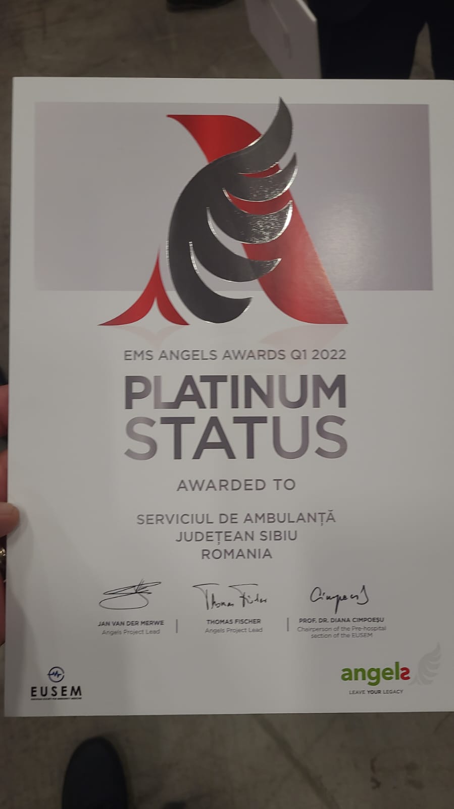 „SAJ Sibiu, a primit distincția PLATINUM, care întărește încă o data faptul ca echipa noastră, formată din medici, asistenți medicali și ambulanțieri este dedicată 100% în ceea ce privește asistența medicală de urgență (în cazul de față cu Accidentul Vascular Cerebral). Felicitări angajaților SAJ pentru munca depusă în interesul sănătății cetățenilor județului Sibiu”, transmit reprezentanții Ambulanței Sibiu.