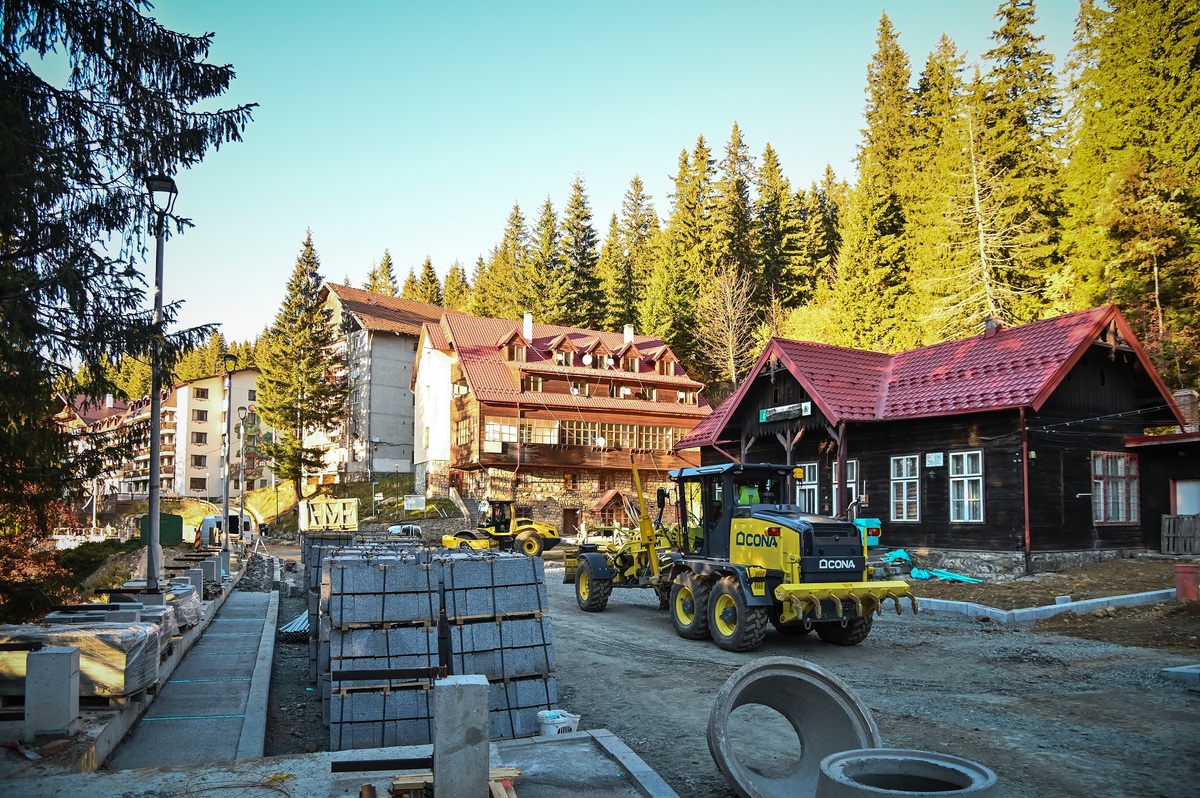 Totodată, firmele contractante au lucrat la amenajarea drumului, a trotuarelor, a aleilor și parcărilor. Trotuare s-au creat doar în zona de hoteluri și în zona de cabane, acestea amenajându-se în prezent cu asfalt. Instalarea noilor borduri s-a finalizat și aceasta și se lucrează în prezent la turnarea primului strat de asfalt pe carosabil (operațiune finalizată în proporție de 90%). Dacă vremea permite, constructorul este pregătit să aștearnă și stratul asfaltic de uzură pe carosabil, mai transmite Primăria.