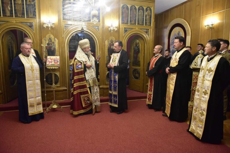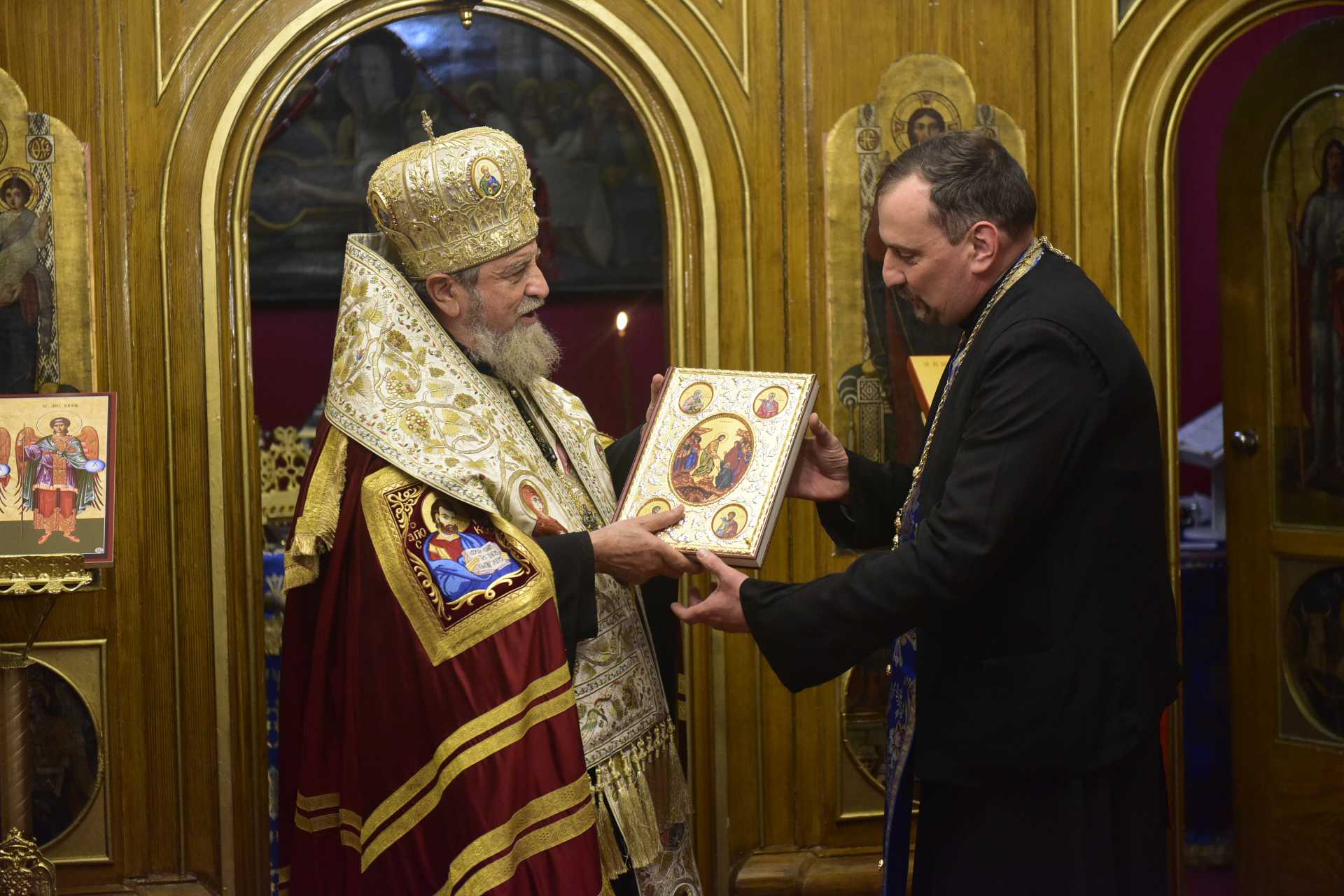 În semn de mulţumire şi de fiască supunere, părintele Adrian Drăgușin i-a oferit în dar ierarhului o icoană Sfinții Arhangheli Mihail și Gavril.