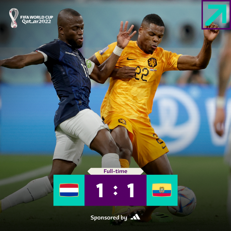 În celălalt duel al grupei, olandezii s-au chinuit în al doilea meci la rând să facă față unei echipe ambițioase. Dacă în primul meci au avut noroc, marcând de două ori în poarta Senegalului, de data aceasta ecuadorienii le-au creat probleme. Olanda a început meciul în forță, iar în minutul 6 a deschis scorul prin Cody Gapko. Acesta a și fost unicul șut pe spațiul porții al Ecuadorului în tot meciul. În ultima fază a primei reprize Ecuador a egalat, însă golul a fost anulat pentru offside, plecând la vestiare revoltați. În a doua parte a meciului, sud-americanii au ieșit pe teren mult mai determinați, lăsându-i pe olandezi derutați. Insistența lor a dat roade după numai 4 minute – căpitanul Enner Valencia a egalat din fața portarului care a respins mingea în urma unui șut puternic, devenind cel mai bun marcator de până acum (3 goluri).