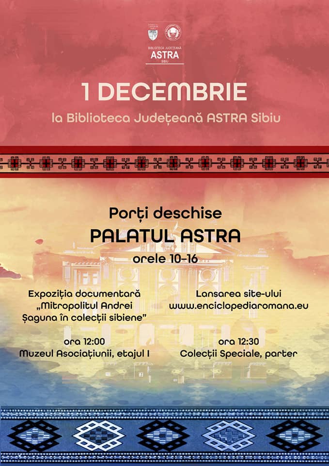 Dar Ziua Națională a României nu înseamnă numai mâncare, ci și necesitatea de a cunoaște trecutul. De la ora 12:00, la sediul istoric al Bibliotecii Județene Astra, de pe strada George Barițiu, nr. 5, va fi inaugurată o expoziție documentară dedicată Mitropolitului Ardealului Andrei Șaguna, care este apreciat, așa cum spunea ÎPS Laurențiu ieri de Hramul Catedralei Mitropolitane din Sibiu, „pentru ceea ce a făcut pentru Biserica Neamului și pentru drept credincioșii creștini ai Bisericii din Transilvania”, dar și pentru că „e cel care a reînființat Mitropolia Ardealului, distrusă de vitregiile vremii la 1700”.