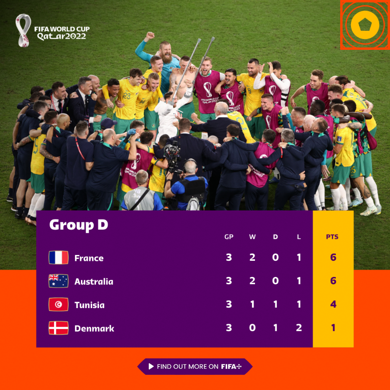 În celălalt meci, Tunisia a obținut o victorie istorică, 1-0 contra Franței. O echipă a Franței care, probabil, a arătat cel mai slab joc de la acest turneu, chiar dacă a jucat cu rezervele. Introducerea pe teren în ultima jumătate de oră a vedetelor Mbappe, Griezmann, Rabiot și Dembele nu a adus rezultate. Tunisienii aveau o șansă de calificare și s-au ținut de ea, profitând de prezența pe teren a echipei de rezervă a Franței, care juca mai rău decât una de cartier. Entuziasmul africanilor a fost redus de golul Australiei, iar golul egalizator al Danemarcei, care să salveze Tunisia, nu a venit.
