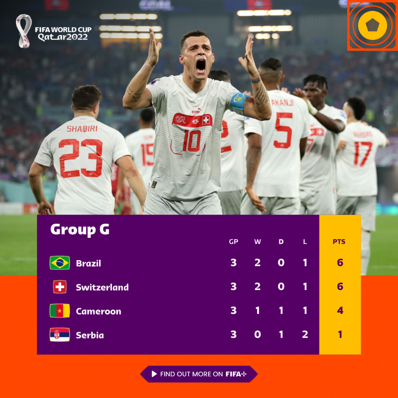 În grupa G, Serbia s-a chinuit să demonstreze că succesul din calificări îi poate aduce rezultate bune și la competiția din Qatar. Adversara sa, Elveția, a fost tare pe poziții însă. În minutul 20 a deschis scorul prin Shaqiri. O reușită care îl face pe elvețian al treilea jucător, după Cristiano Ronaldo și Leo Messi care marchează la ultimele trei campionate mondiale (2014, 2018, 2022).