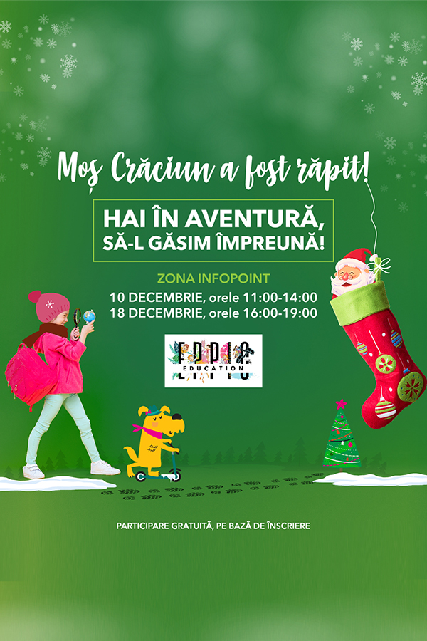 Pe 10 și pe 18 decembrie, Shopping City Sibiu îi invită pe micii exploratori curajoși să găsească indiciile dispariției lui Moș Crăciun, într-o aventură super distractivă. În 45 de minute, aceștia vor avea misiunea de a salva Crăciunul, luând parte la o căutare interactivă și misterioasă.