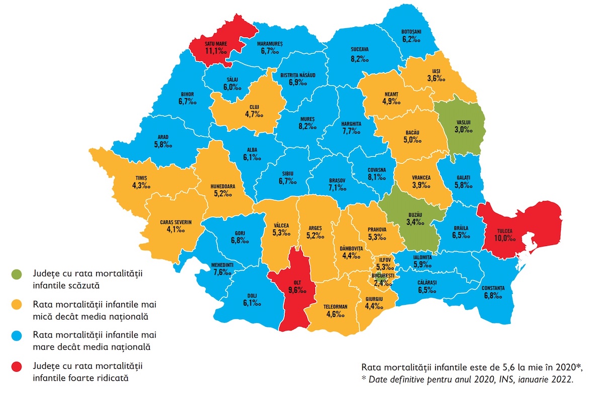 În cifre absolute, 1.104 copii cu vârsta sub un an au murit în anul 2020 în România, multe dintre aceste decese putând fi prevenite prin acces la servicii medicale în timpul sarcinii și prin dotarea maternităților și secțiilor de neonatologie cu aparatură medicală performantă.