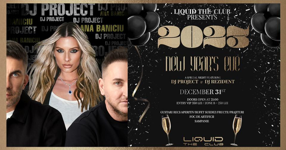 Cine vrea să petreacă Noaptea dintre ani la Liquid se va putea distra pe ritmurile cântecelor celor de la DJ Project însoțiți de Ana Baniciu. Intrarea costă 350 de lei în zona VIP și 250 de lei în zona B. VIP ACCES cuprinde Bufet suedez ALL INCLUSIVE, candy Bar, fructe, șampanie, foc de artificii. Băuturile sunt contra-cost. GENERAL ACCES cuprinde Bufet suedez ALL INCLUSIVE, candy bar, fructe, șampanie, foc de artificii. Băuturile sunt contra-cost.