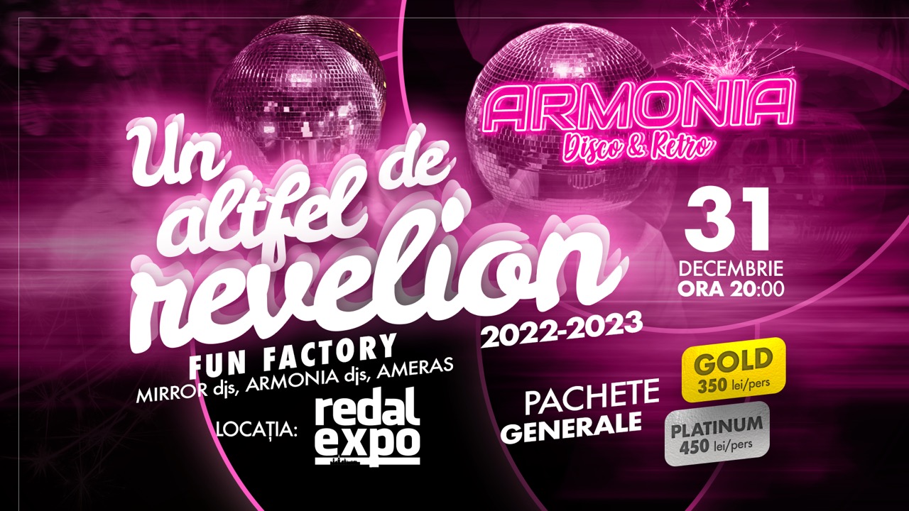 „Te invităm să sărbătorim împreună trecerea dintre ani pe ritmuri disco&retro în cea mai renumita locație de evenimente din Sibiu - Redal Expo. Revelionul ARMONIA disco&retro va fi șansa ta să sărbătorești trecerea dintre ani în mod total inedit, pe ritmurile anilor '80-'90-'00, printr-un SUPER CHEF de tip clubbing.