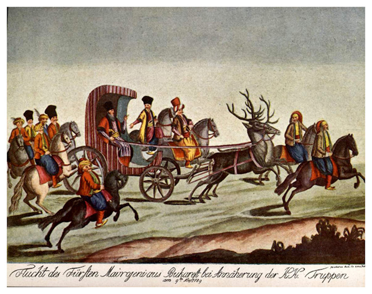 O imagine din 1789 a extravaganțelor atribuite fanarioților din Muntenia: Nicolae Mavrogheni călătorind prin București într-o trăsură trasă de cerbi cu coarnele poleite cu aur. Sursa foto: wikipedia.org