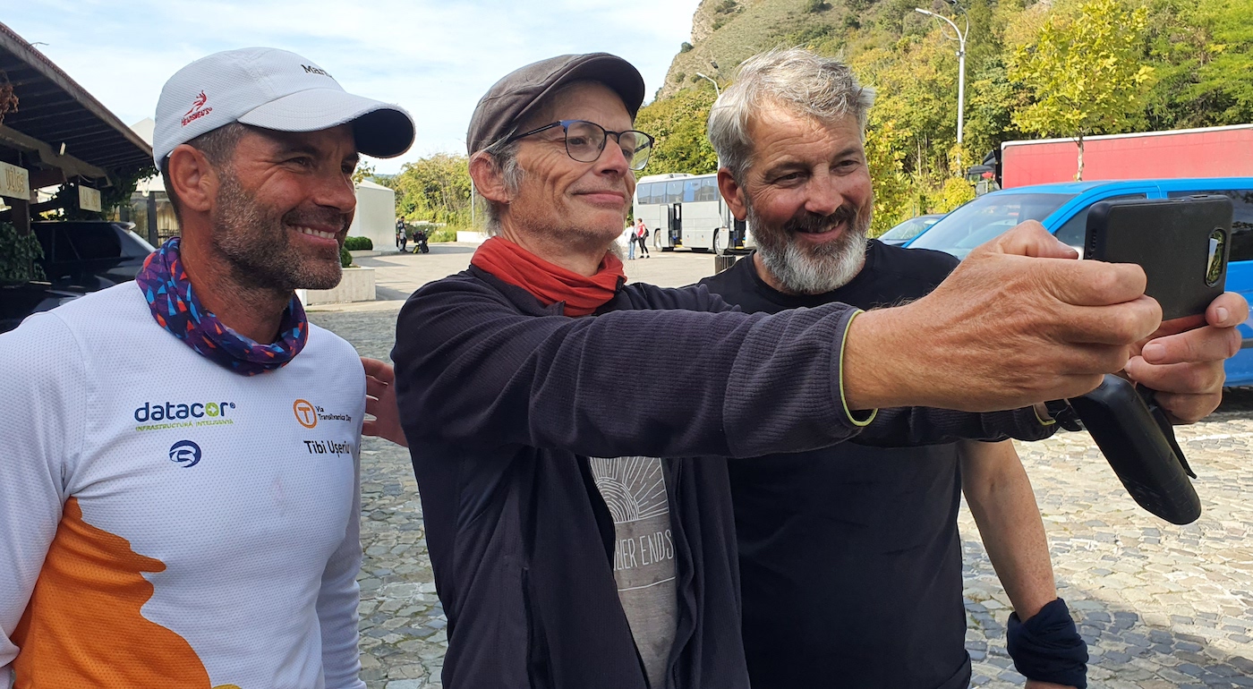Tibi Ușeriu (stânga) și Alin Ușeriu (dreapta) fotografiindu-se cu un cetățean german care a terminat de parcurs pe jos Via Transilvanica înainte cu o zi de a o termina și cei doi frați