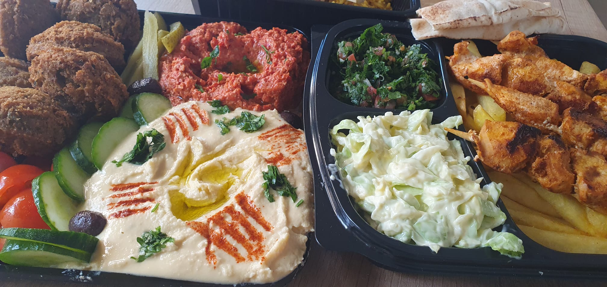 Pentru a încerca bucătăria libaneză, într-o zi ploioasă pe malul Cibinului, am comandat așa: Frigărui cu salată Colleslaw, falafel, hummus, batata harra, mouhamarra și orez makloubeh. Am încercat să iau din fiecare câte ceva, astfel încât să pot degusta o varietate mare de arome. Problema este că unele dintre ele sunt atât de exotice pentru papilele noastre încât cu greu pot fi descrise.